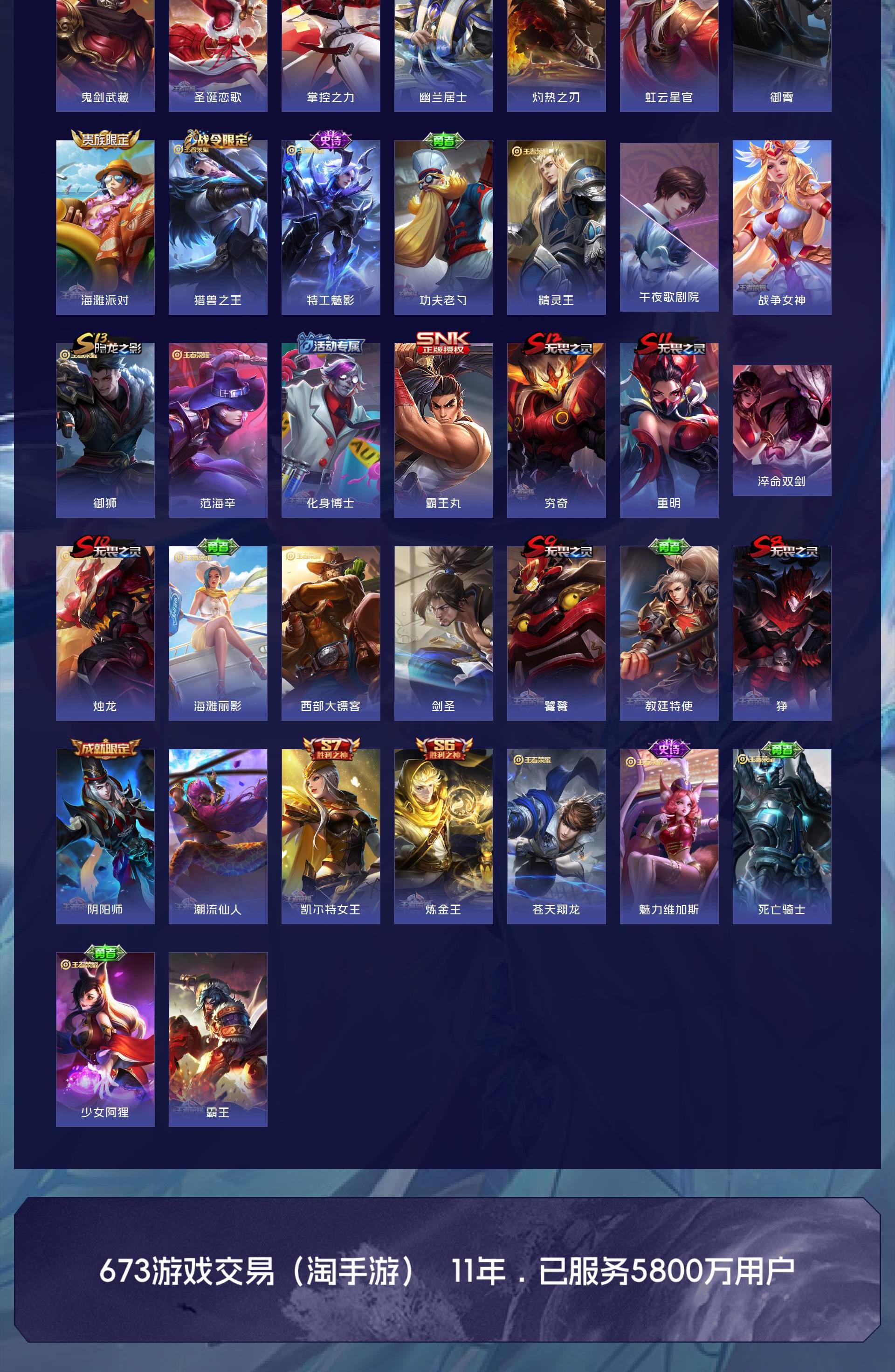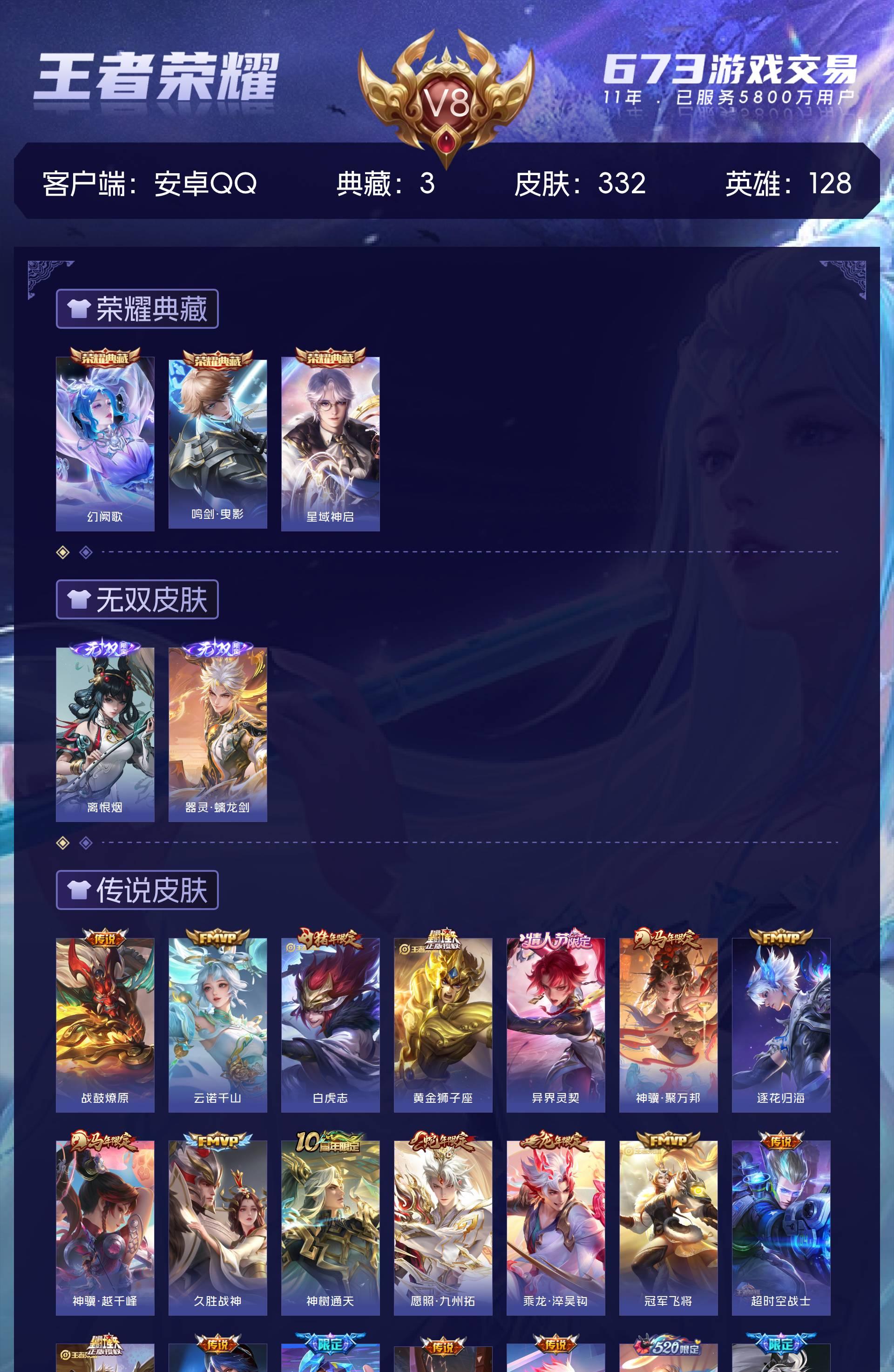 V8 皮肤332 英雄128 非凡王者 荣耀典藏3 无双皮肤2 星传说1 传说36