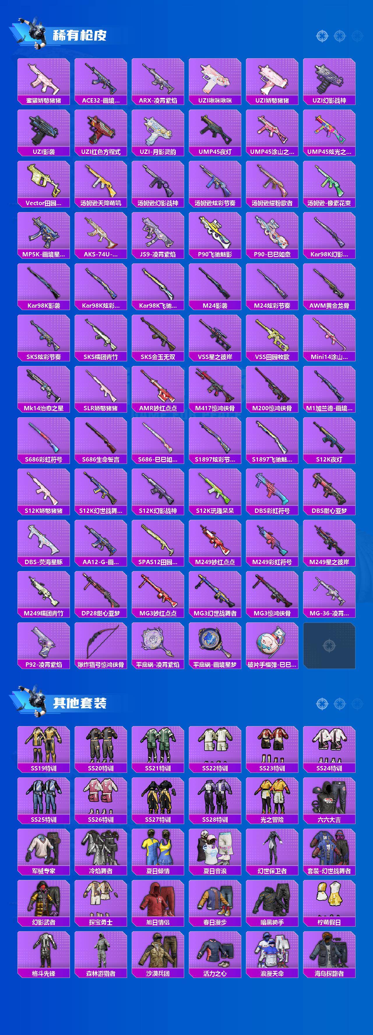 【粉色枪皮等级】:AUG-星之彼岸(七级),AUG-暖羊咩咩(五级),AKS-74U-森灵之息(五级),Kar98K-巳巳如意(五级),Mk14-福马献瑞(五级),AA12-G-萌