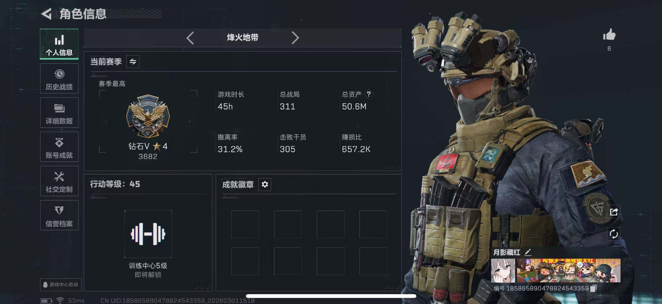 50m总资产-11357k哈伏币-45烽火等级-钻石-21战场等级-上等兵