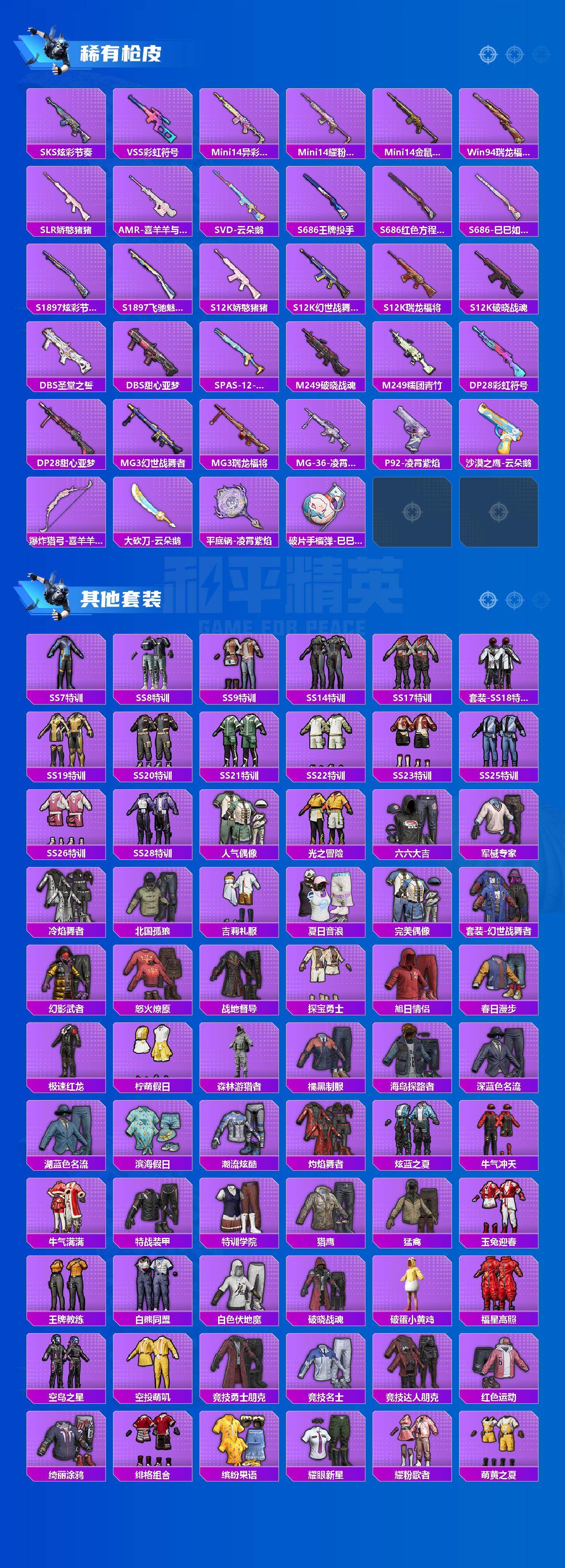【粉色枪皮】:ACE32-萌骑漫游,AKS-74U-森灵之息,Kar98K-巳巳如意,Mk14-福马献瑞,DP-28-豹影疾电