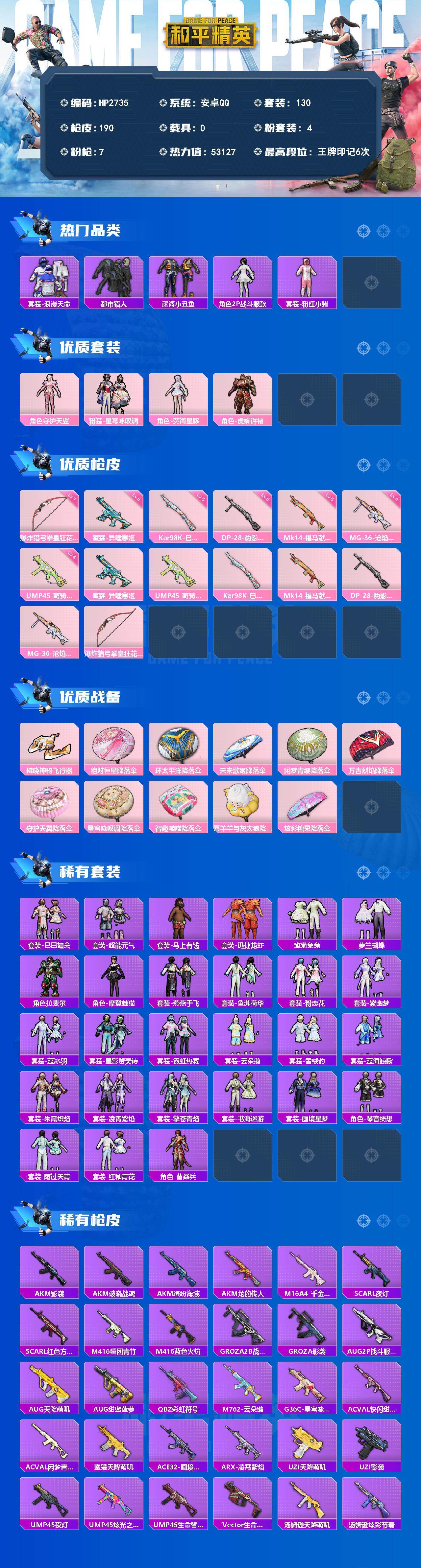 【HP2735】130套装/枪械7/装备222/战备129/王牌印记6/热力值53127/六级蜜獾-异瞳寒姬/四级UMP45-萌骑冒险/五级Kar98K-巳巳如意/五级Mk14-福马献瑞/五级DP-28-豹影疾电/四级MG-36-沧焰双生/七级爆炸猎弓-拳皇·狂花道/套装-浪漫天命/套装-都市猎人/套装-深海小丑鱼/角色-2P战斗服款/套装-粉红小猪/角色-守护天翼/粉装-星穹咏叹调/角色-荧海星豚/角色-虎痴许褚/蜜獾-异瞳寒姬/UMP45-萌骑冒险/Kar98K-巳巳如意/Mk14-福马献瑞