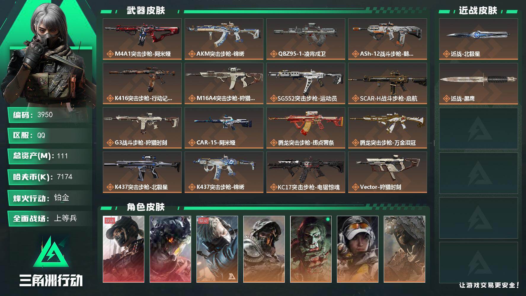 111m总资产-7174k哈夫币-60烽火等级-铂金-30战场等级-上等兵【
