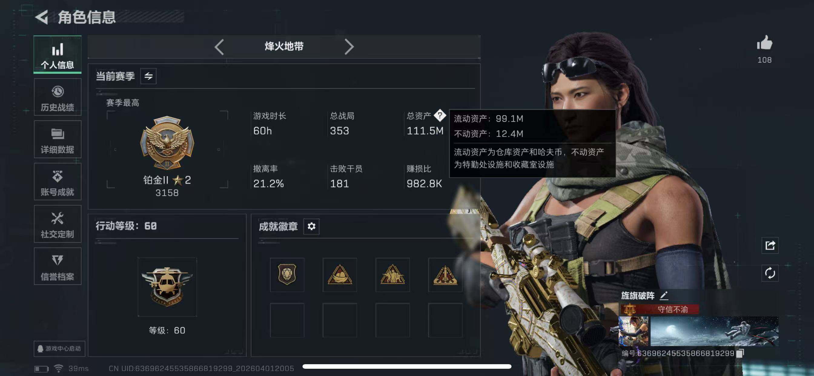 111m总资产-7174k哈夫币-60烽火等级-铂金-30战场等级-上等兵