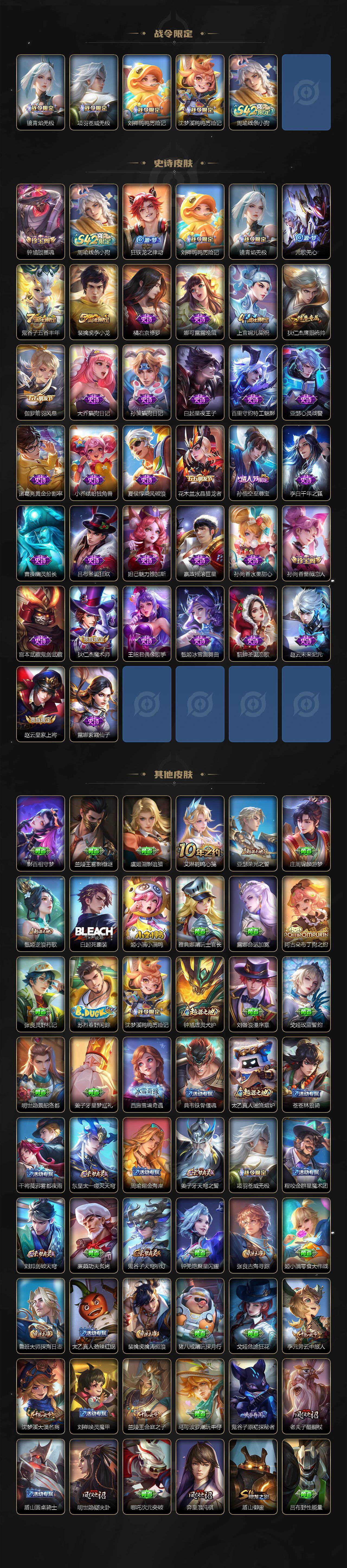 【传说皮肤】:关羽神骥镇沧海,桑启鸣野蒿,澜逐花归海,吕布怒海麟威,赵云淬星耀世,王昭君乞巧织情,镜炽阳神光,干将莫邪久胜战神,花木兰冠军飞将,后羿黄金射手座,孙尚香末日机甲,宫本