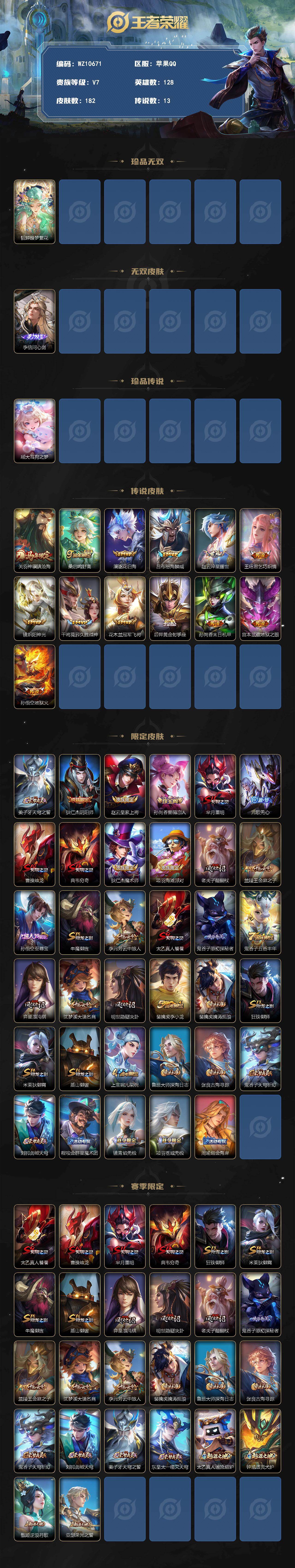 苹果Q-V7-至尊星耀I段位-128英雄-182皮肤-1珍品无双-1无双-1珍品传说-13传说-37史诗