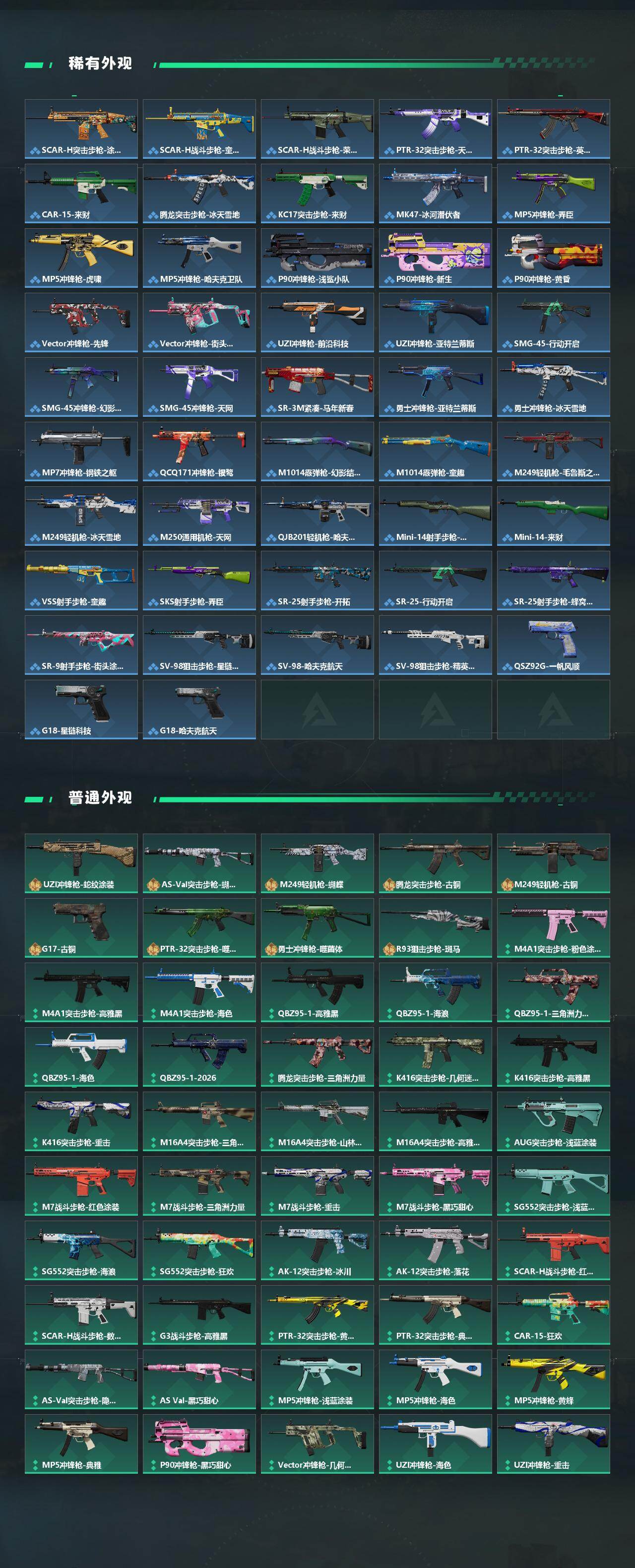 【传说外观】:M4A1突击步枪-阿米娅,M16A4突击步枪-狩猎时刻,SG552突击步枪-点翠,SCAR-H战斗步枪-启航,SCAR-H战斗步枪-荼蘼,G3战斗步枪-狩猎时刻,CAR-15突击步枪-阿米娅,腾龙突击步枪-捞点薯条,K437突击步枪-几何解构,KC17突击步枪-电锯惊魂,KC