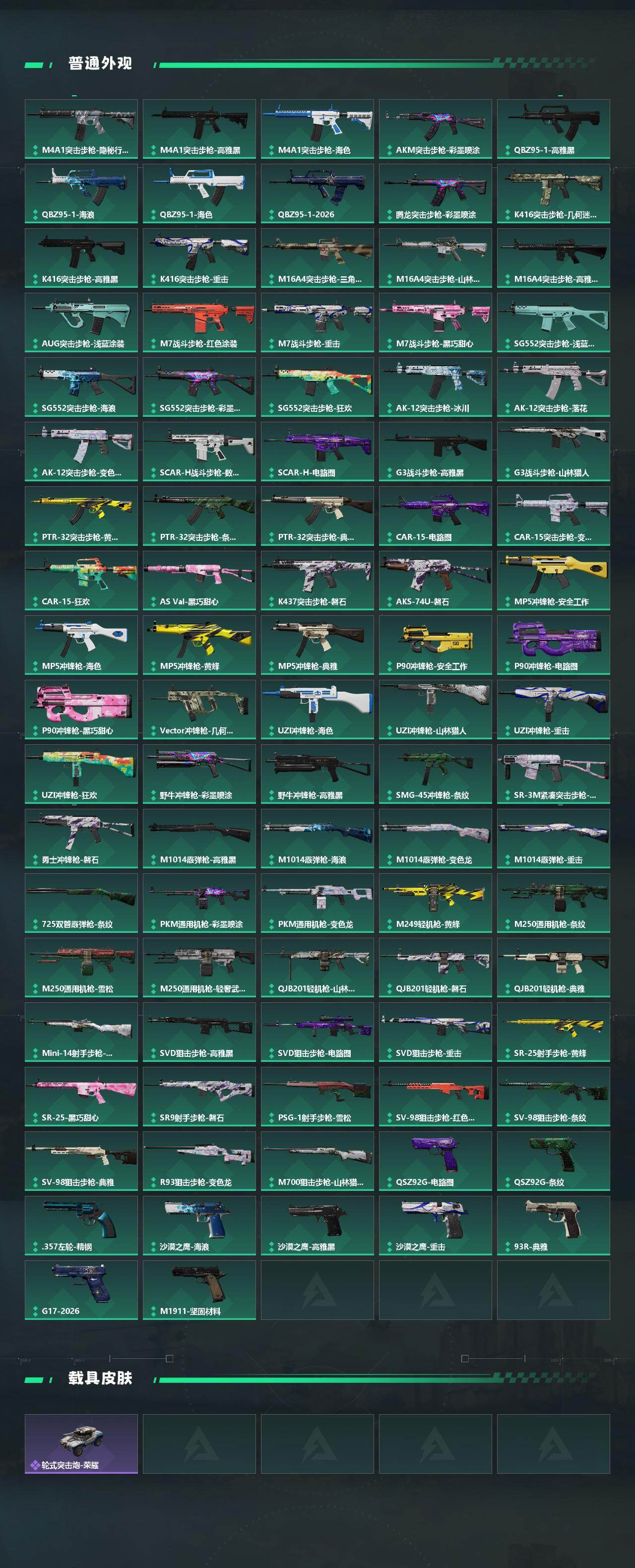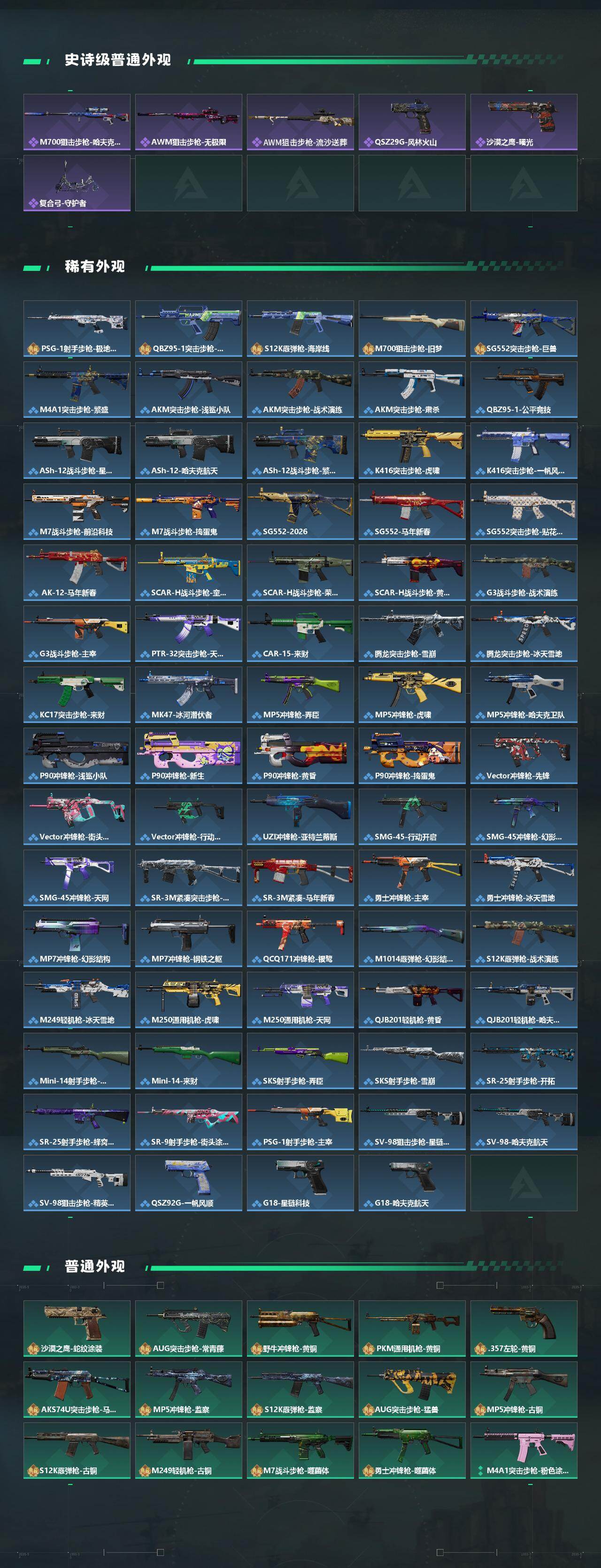 【传说外观】:M4A1突击步枪-蚀金玫瑰,M4A1突击步枪-阿米娅,AKM突击步枪-锦绣,QBZ95-1突击步枪-凌霄戍卫,ASh-12战斗步枪-鹅鸭杀,K416突击步枪-行动记录,SG552突击步枪-运动员,AK-12突击步枪-特斯拉线圈,SCAR
