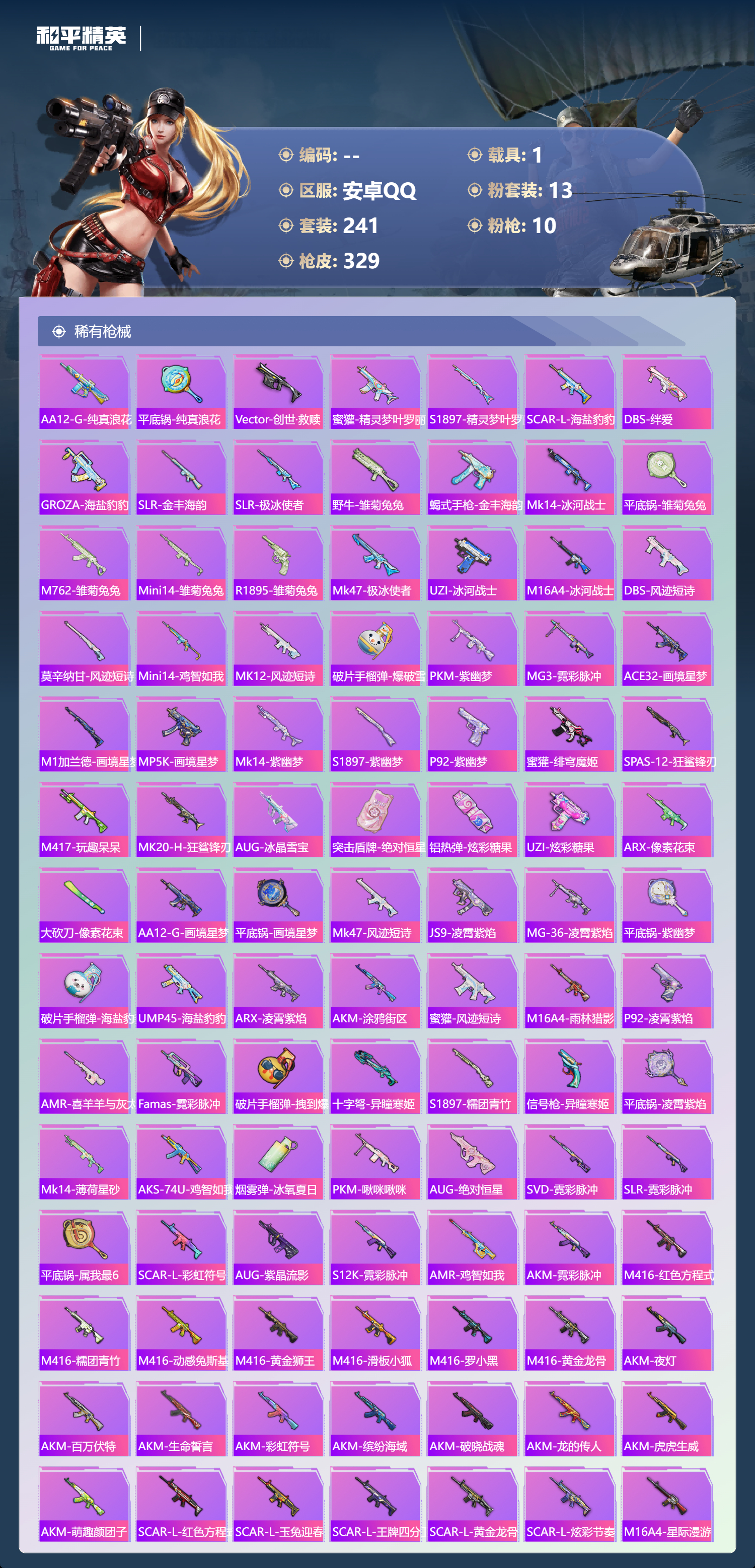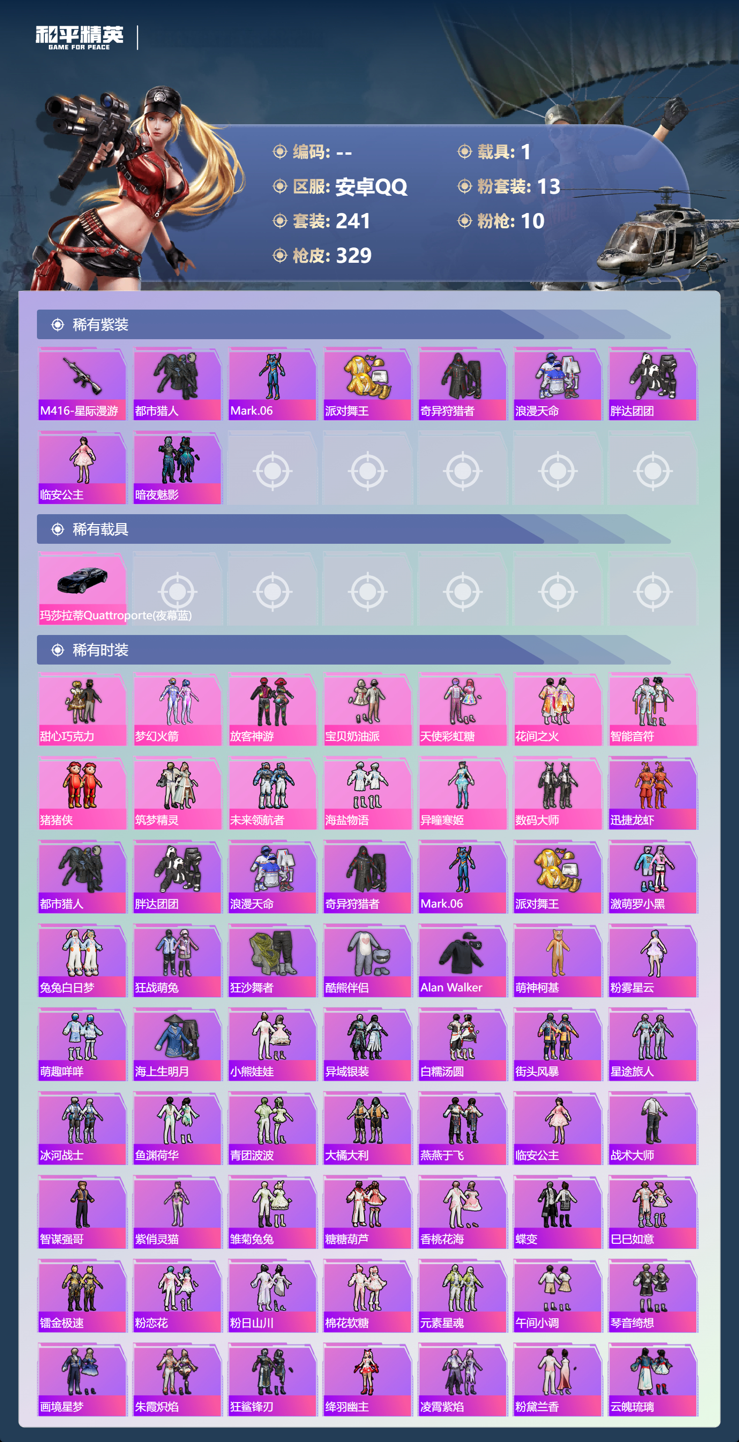 hs67373 安卓手Q-19王牌印记-13粉装-10特效枪-1载具-热力值-241套装-329枪皮-4卓越印记-3传奇印记