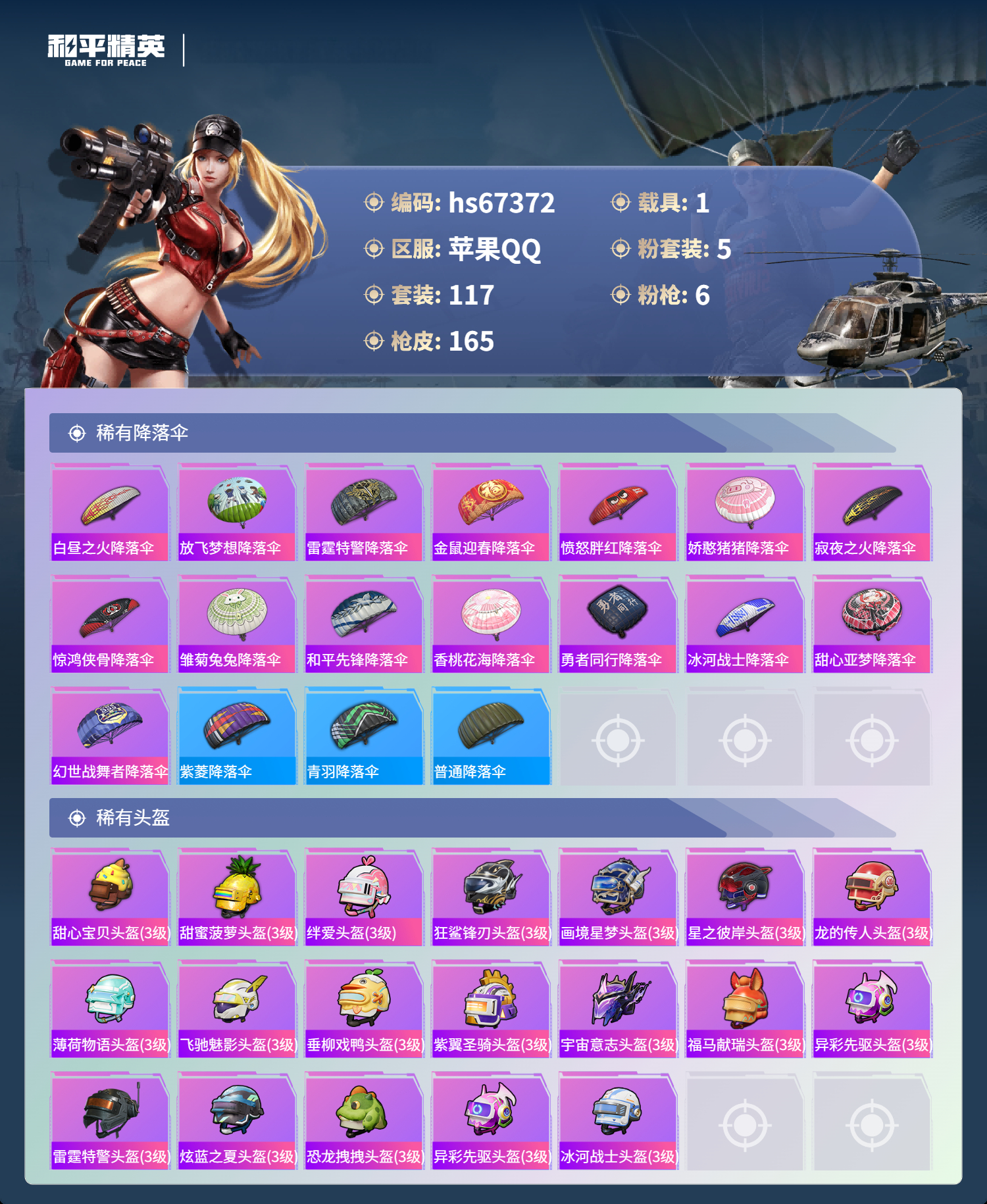 hs67372 苹果手Q-9王牌印记-5粉装-6特效枪-1载具-50829热力值-117套装-165枪皮-2卓越印记-1传奇印记