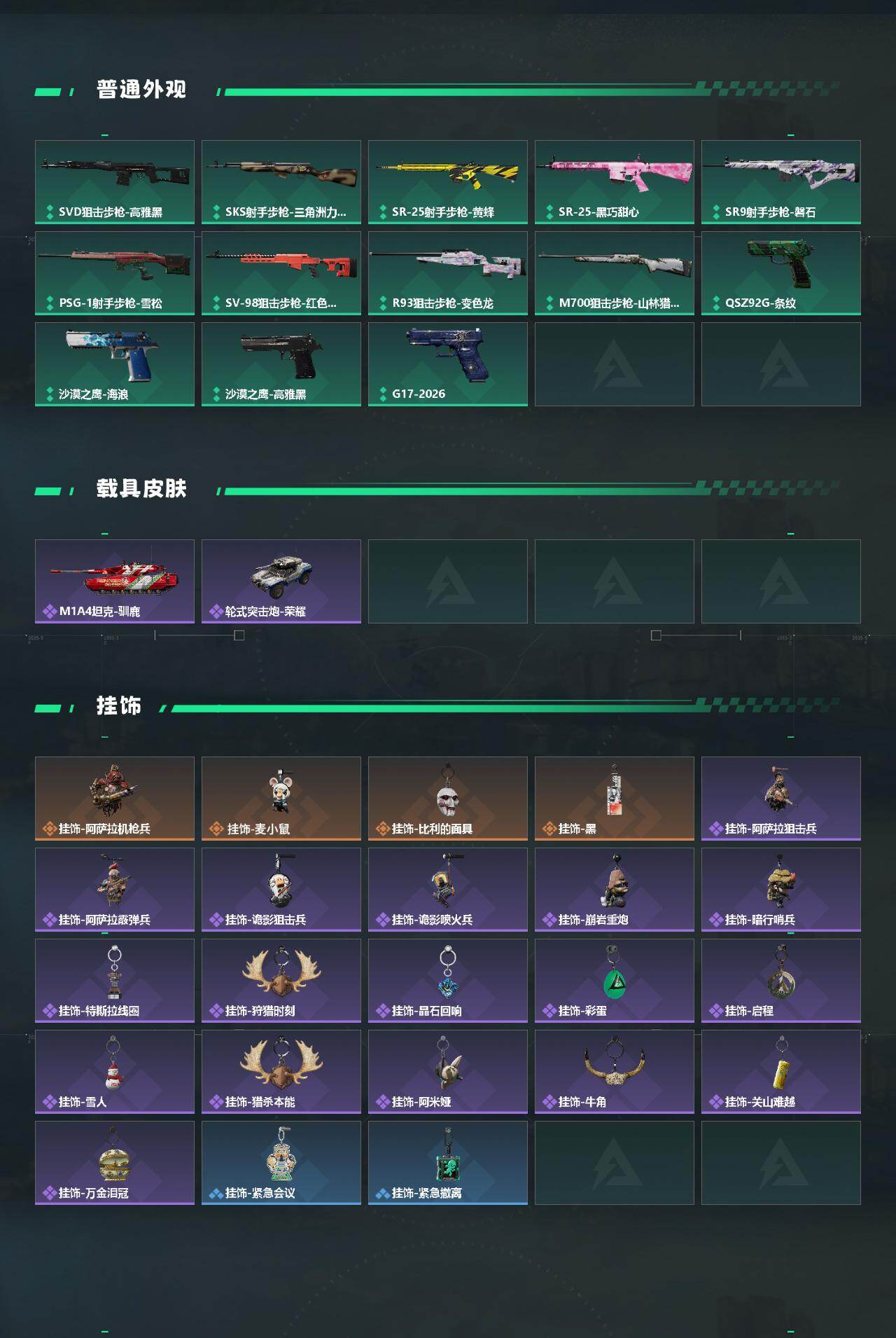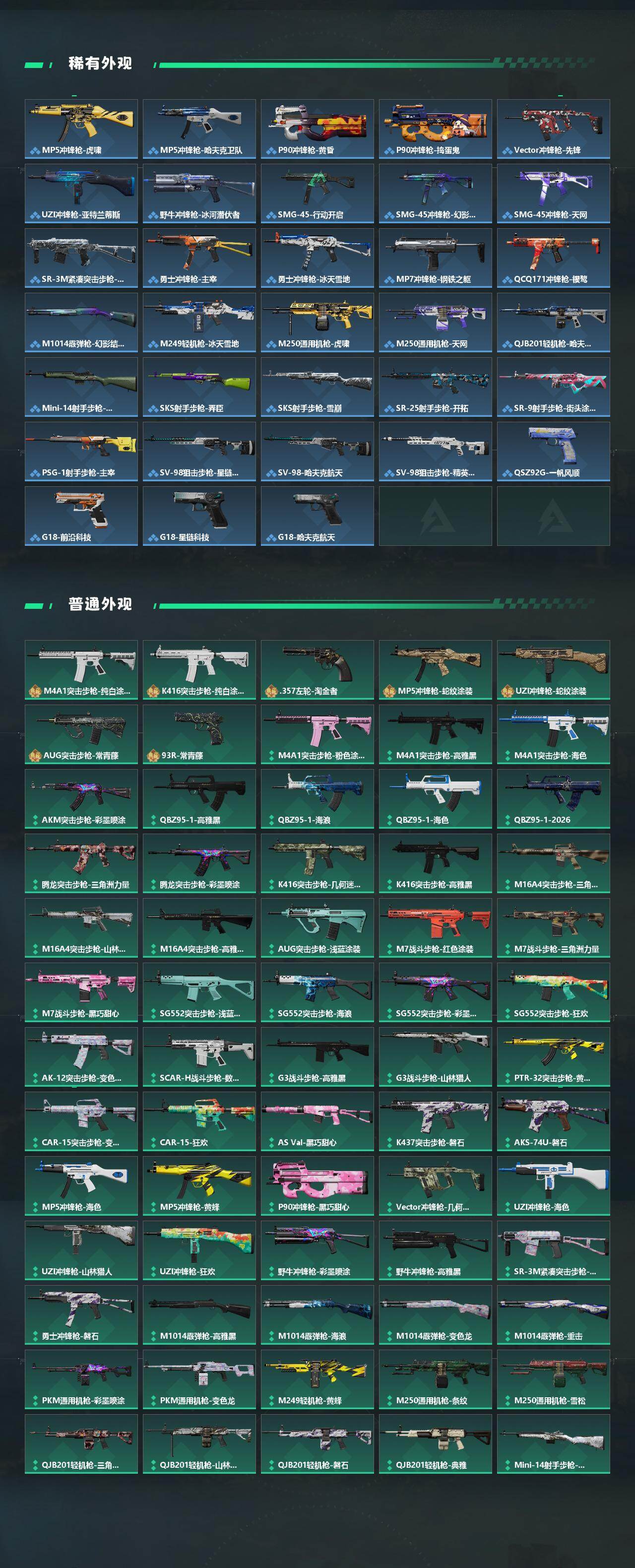 【传说外观】:M4A1突击步枪-阿米娅,M16A4突击步枪-狩猎时刻,SG552突击步枪-运动员,AK-12突击步枪-特斯拉线圈,SCAR-H战斗步枪-启航,G3战斗步枪-狩猎时刻,G3战斗步枪-骑士,腾龙突击步枪-万金泪冠,KC17突击步枪-电锯惊魂,Vector冲锋枪-狩