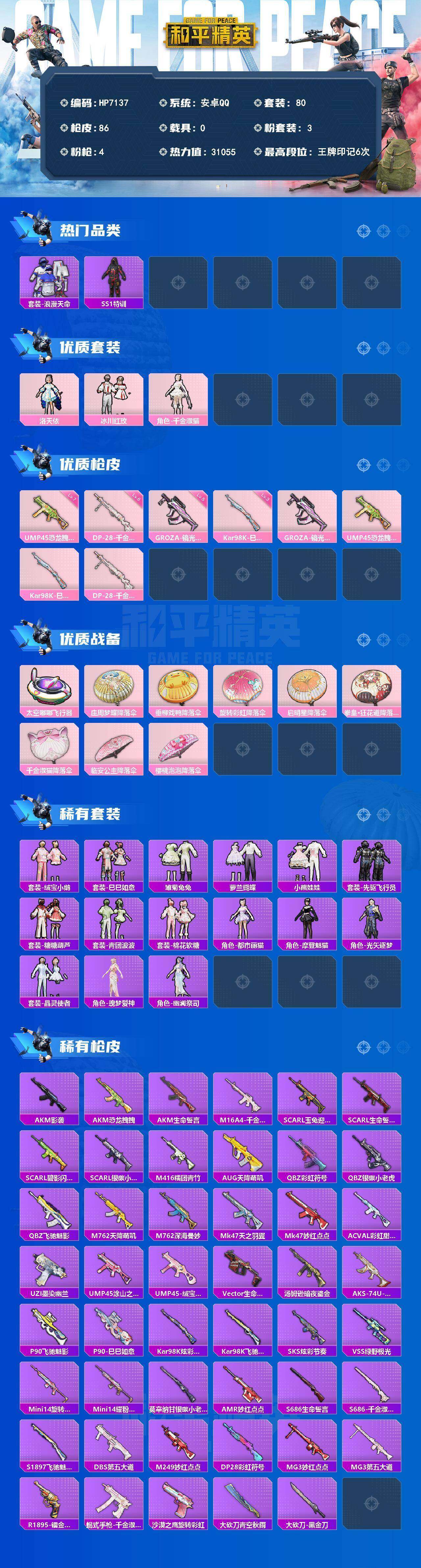(3粉套4粉枪)浪漫天命/洛天依/冰川红玫/千金淑猫/GROZA镜光银凌五级/UMP45恐龙拽拽七级/Kar98K巳巳如意三级/DP28千金淑猫六级/没战神框/HP7137-1粉色飞行器-31055热力值-6王牌印记-80套装-86枪皮