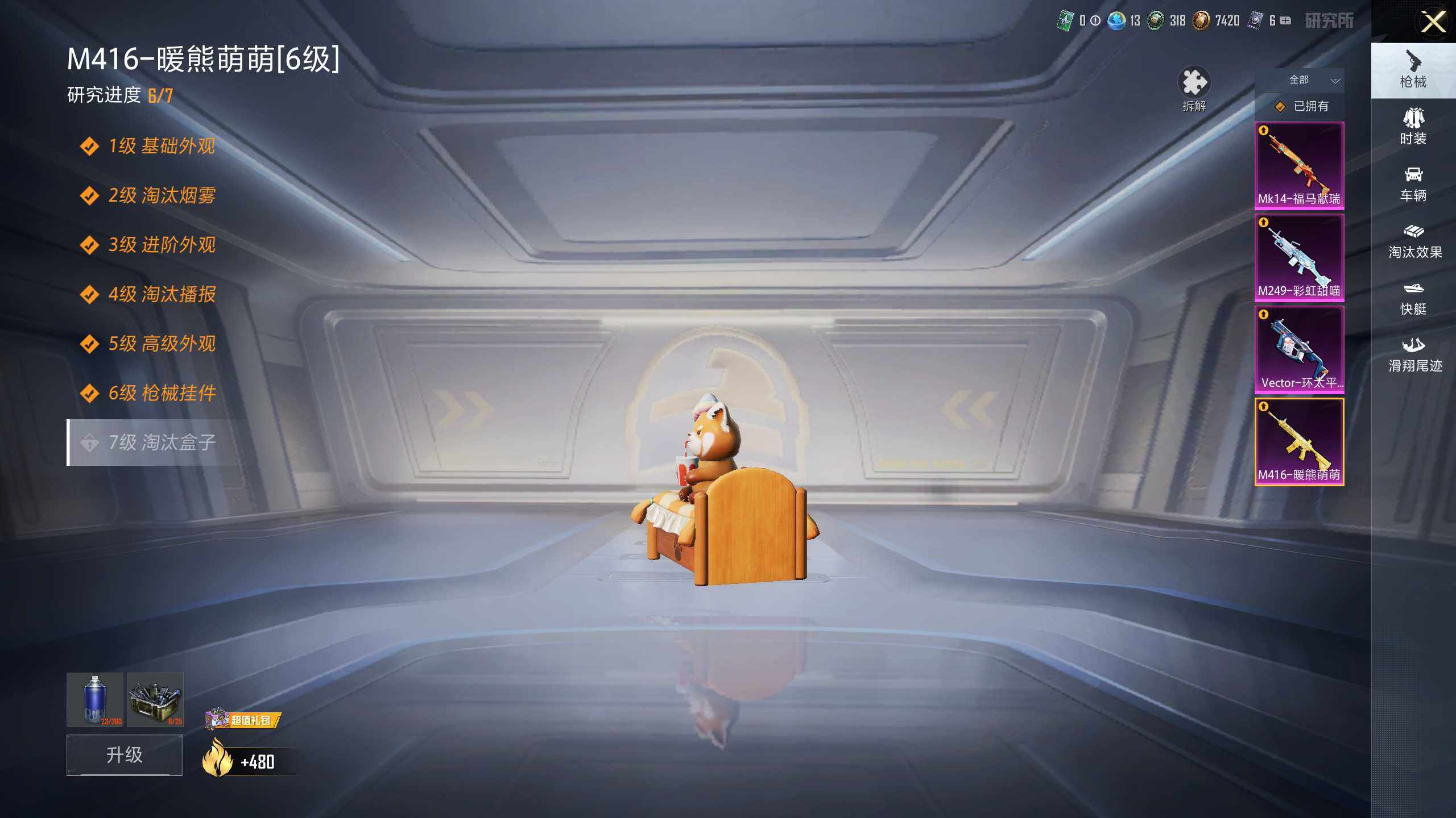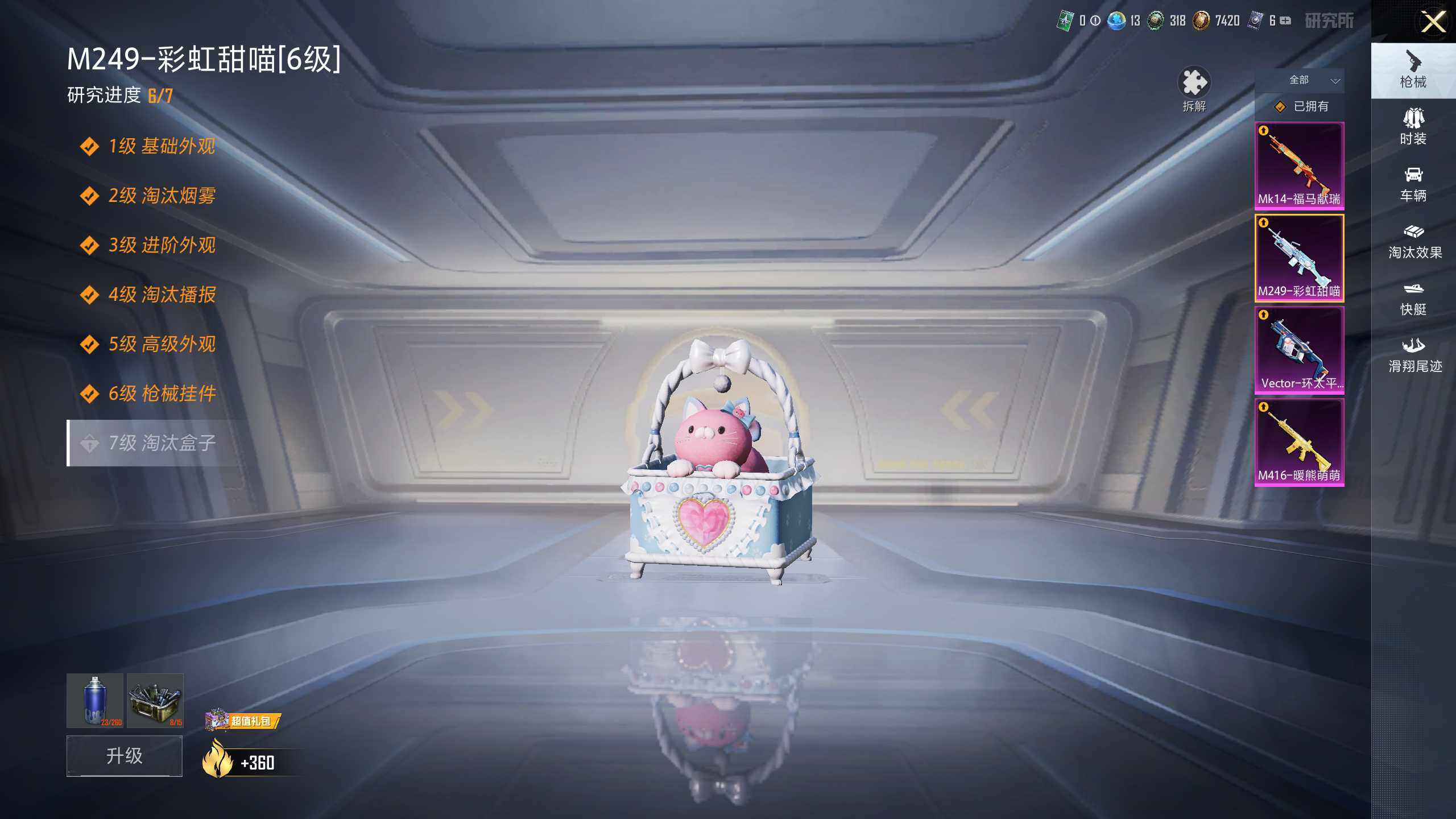【粉色枪皮等级】:M416-暖熊萌萌(六级),Vector-环太平洋(四级),Mk14-福马献瑞(一级),M249-彩虹甜喵(六级)
