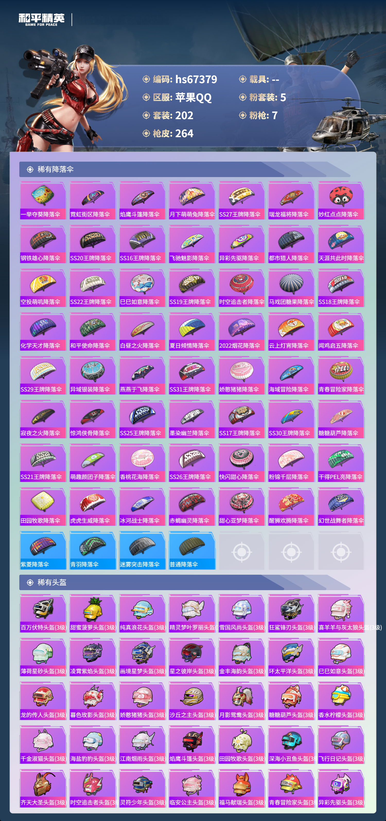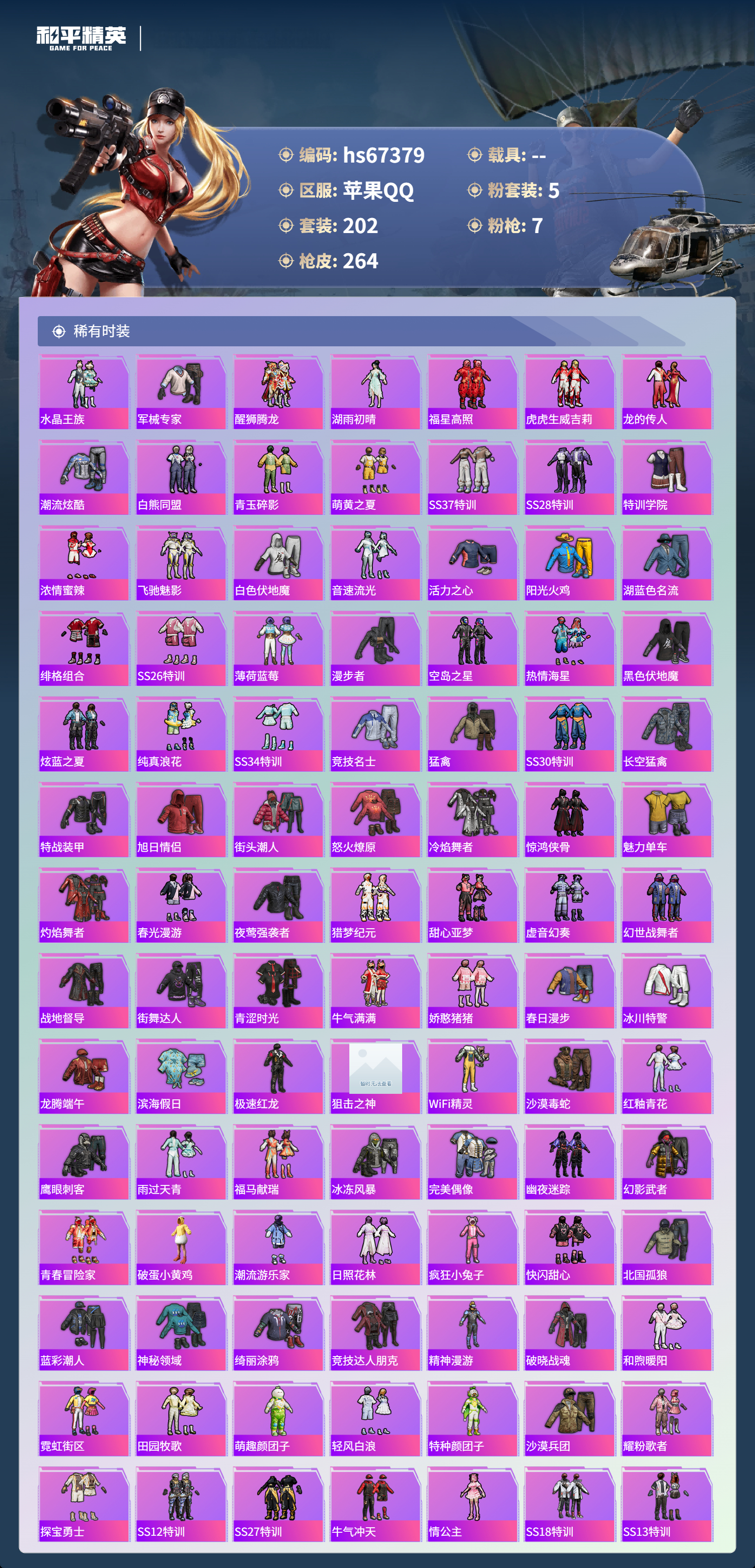 hs67379 苹果手Q-18王牌印记-5粉装-7特效枪-84376热力值-202套装-264枪皮-2卓越印记-1传奇印记