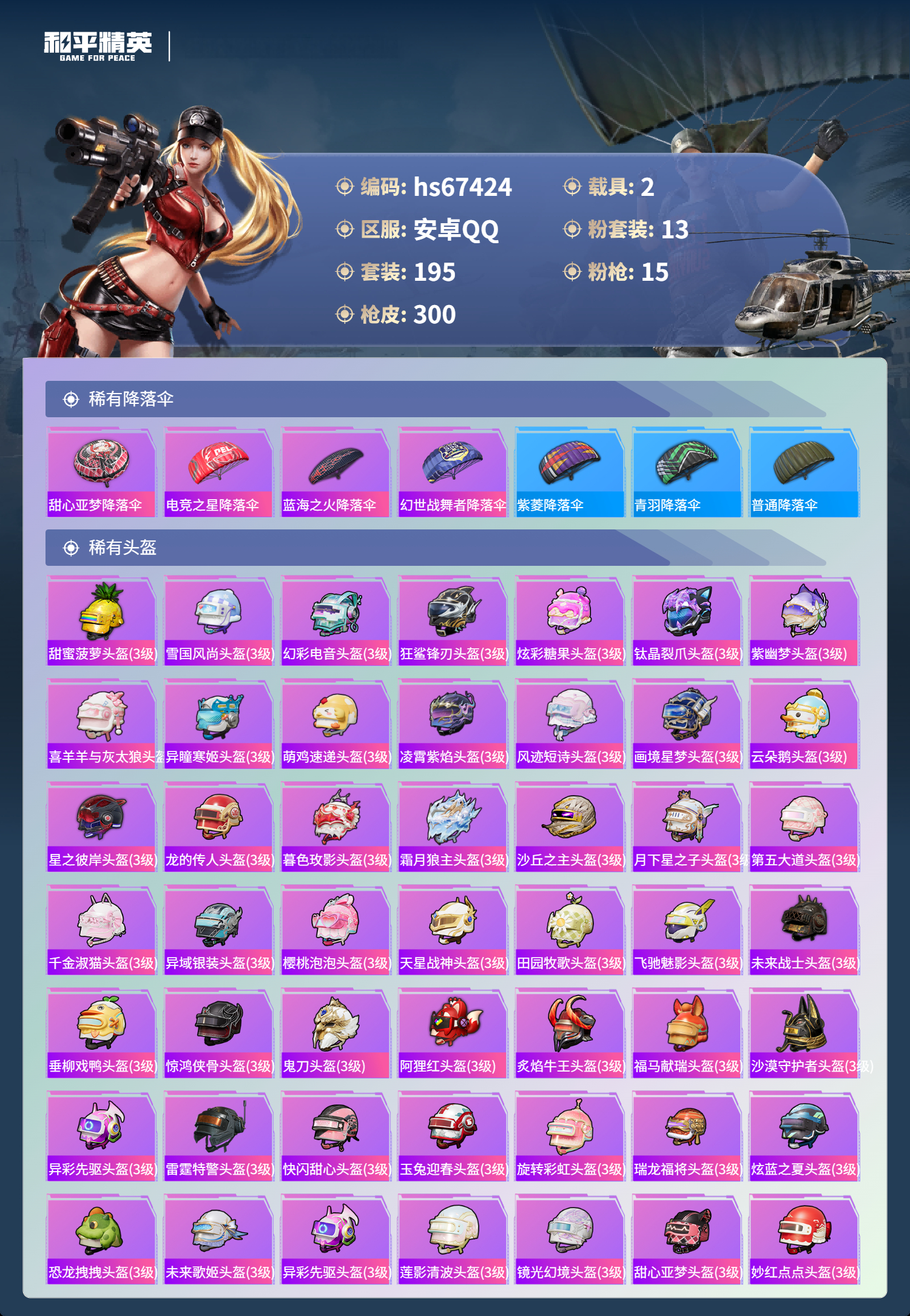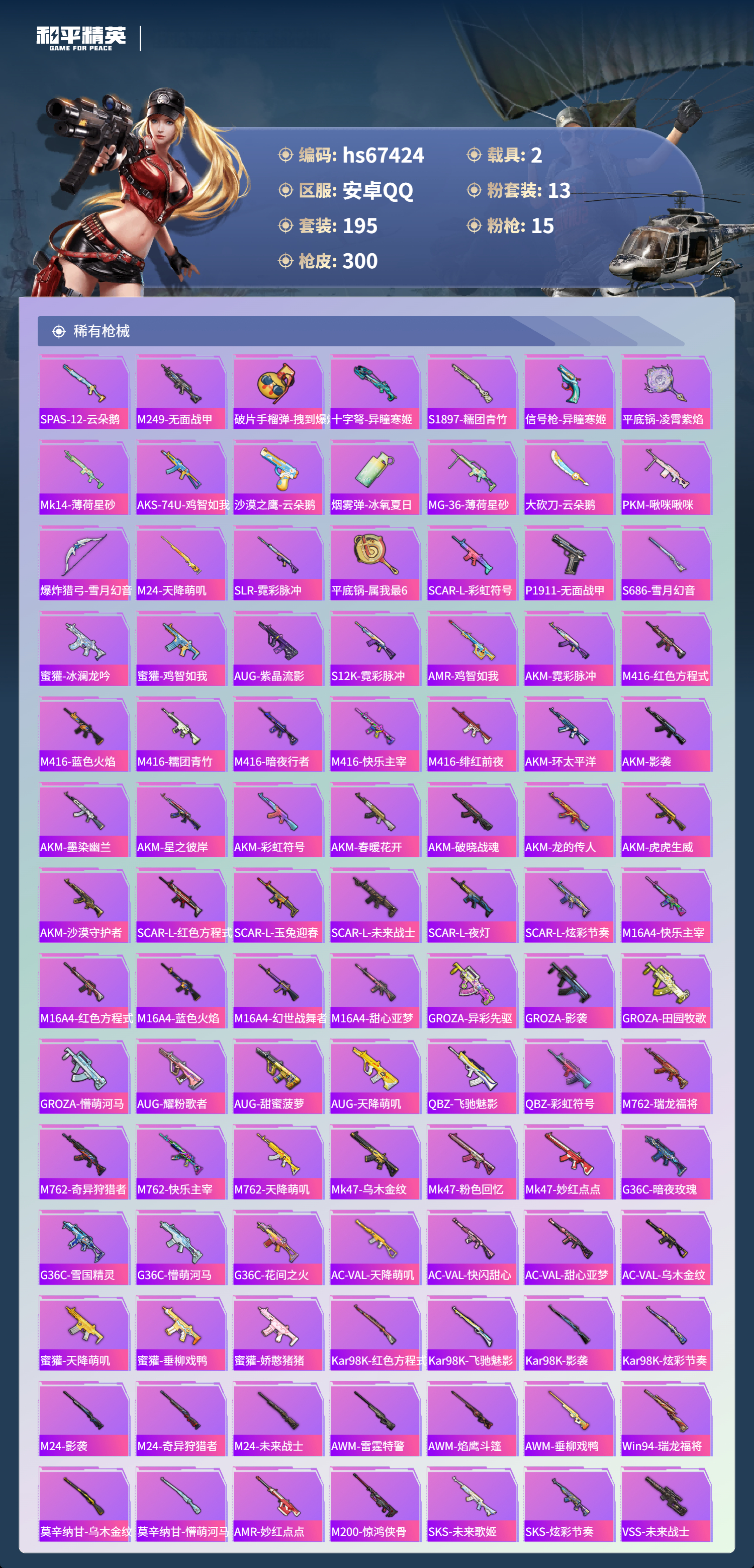 hs67424 安卓手Q-15王牌印记-13粉装-15特效枪-2载具-94952热力值-195套装-300枪皮-1卓越印记