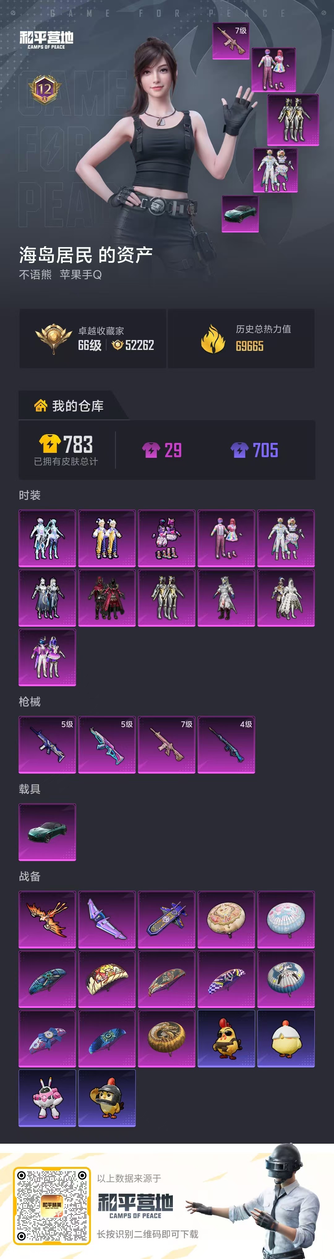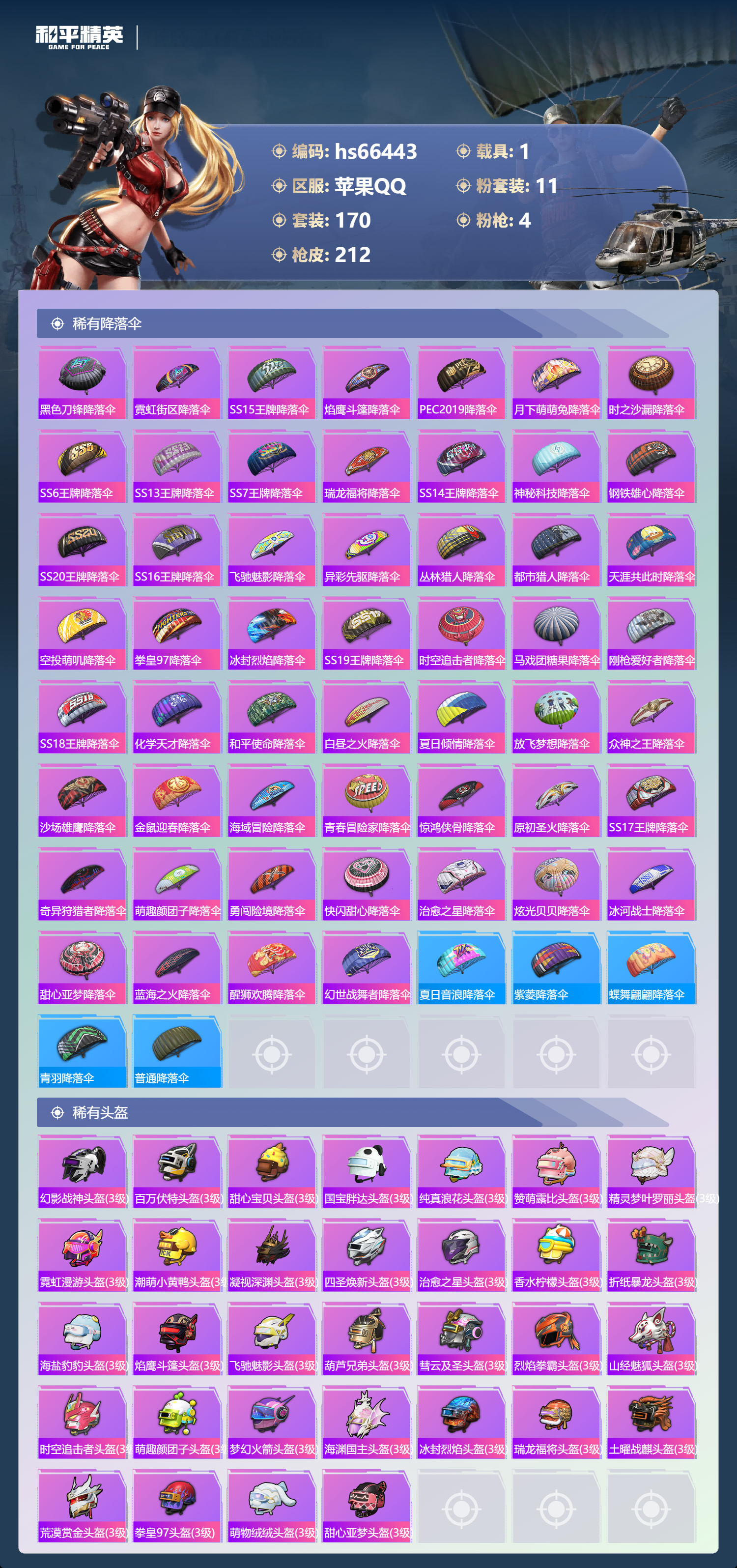 hs66443 苹果手Q-12王牌印记-11粉装-4特效枪-1载具-69680热力值-170套装-212枪皮