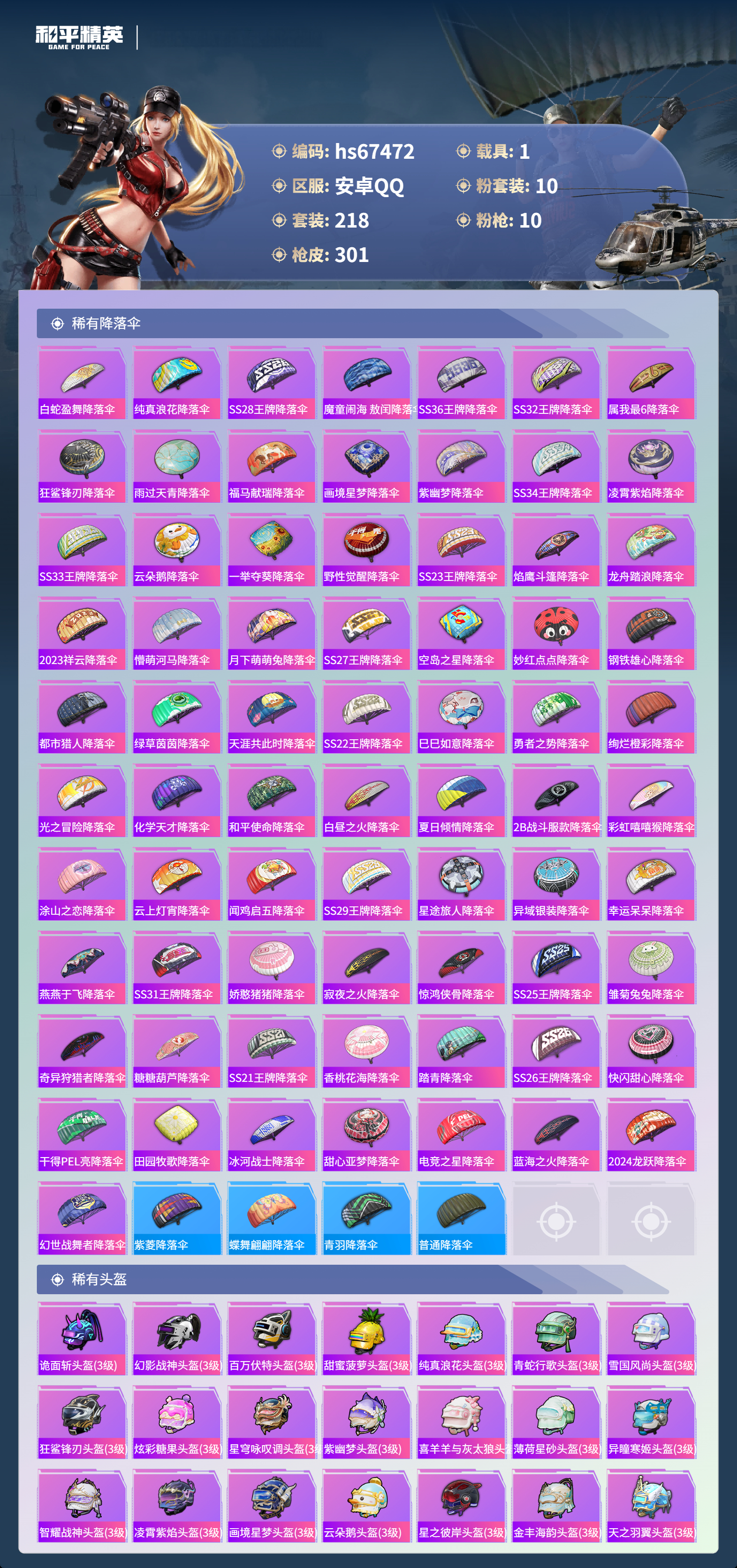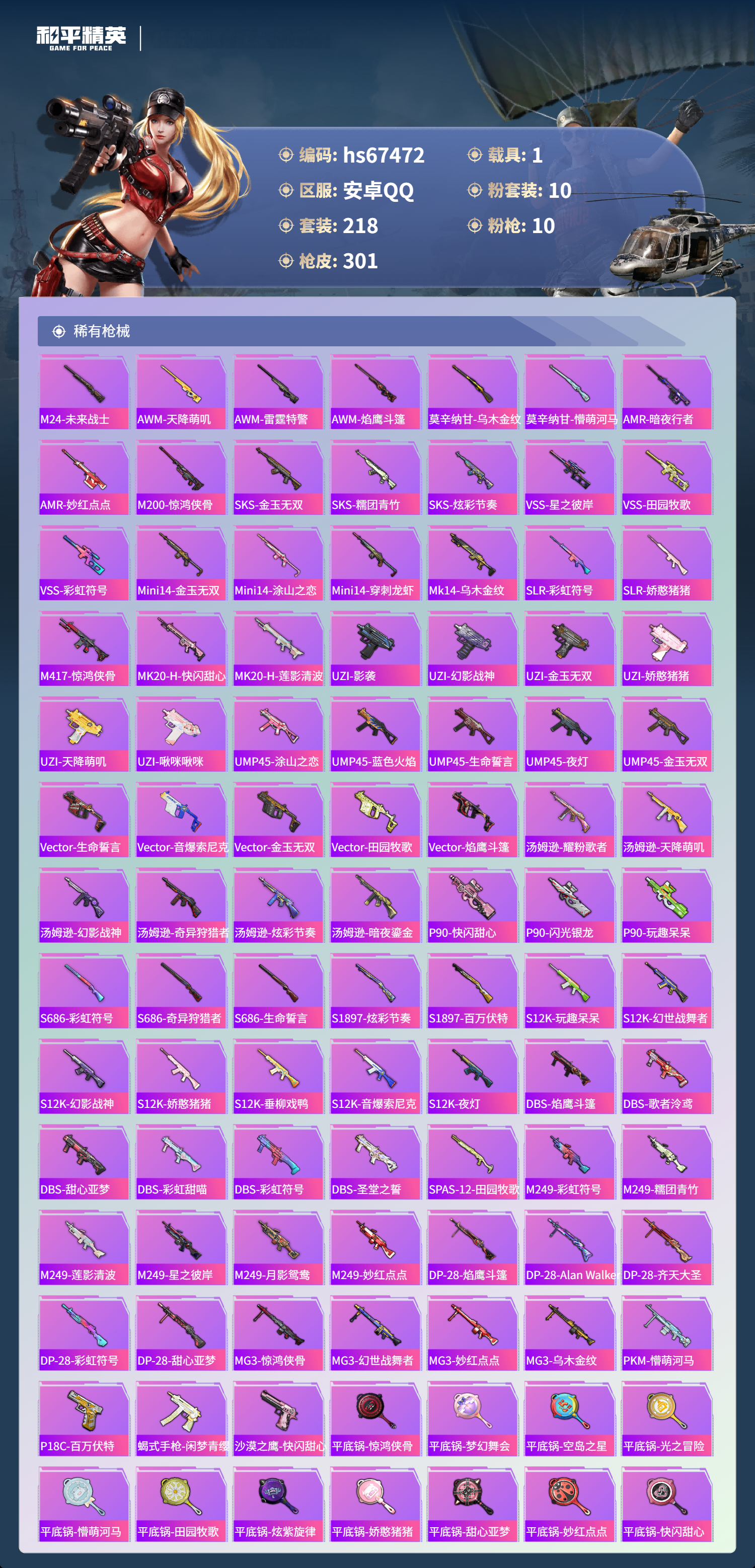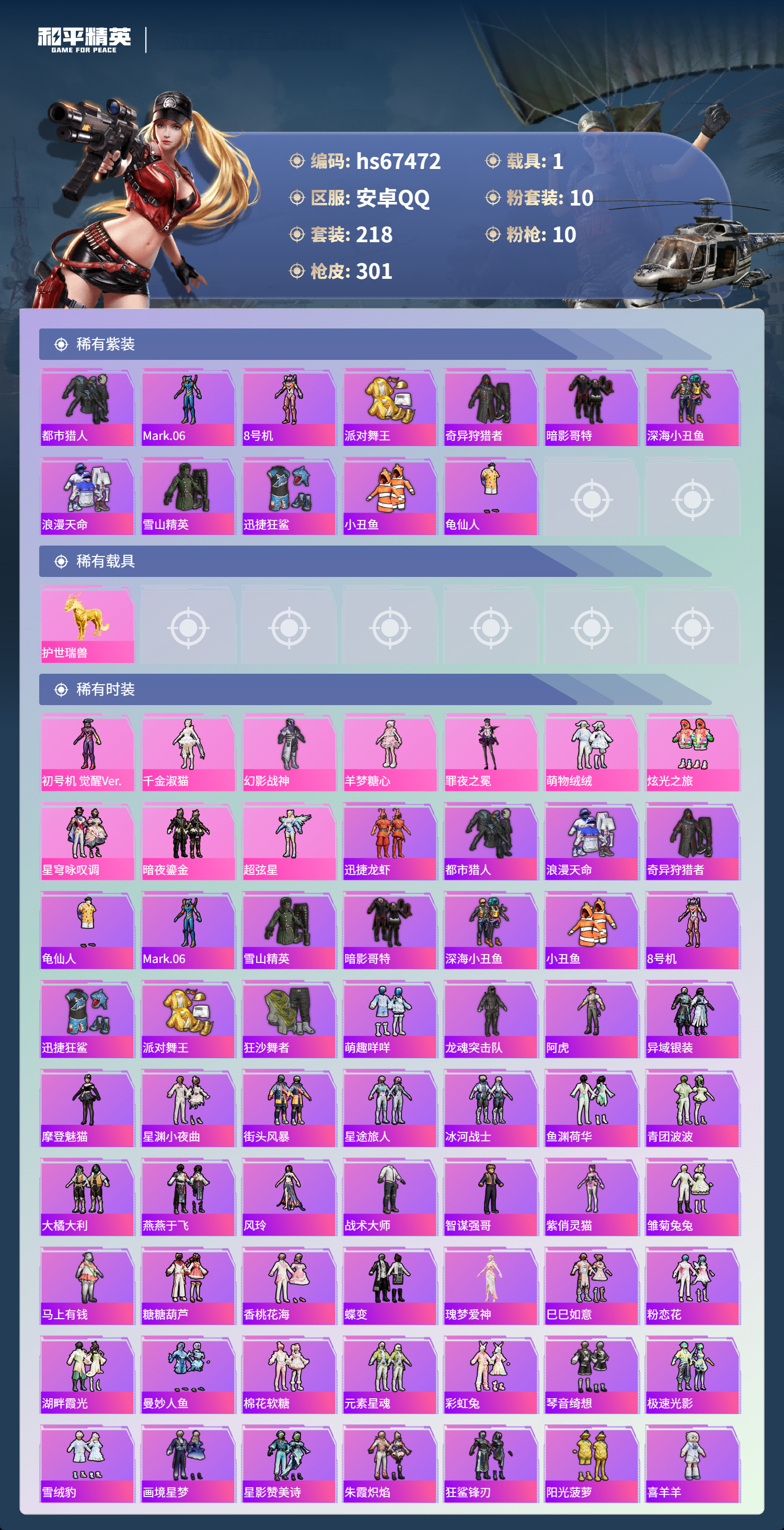 hs67472 安卓手Q-16王牌印记-10粉装-10特效枪-1载具-96012热力值-218套装-301枪皮-6卓越印记-3传奇印记
