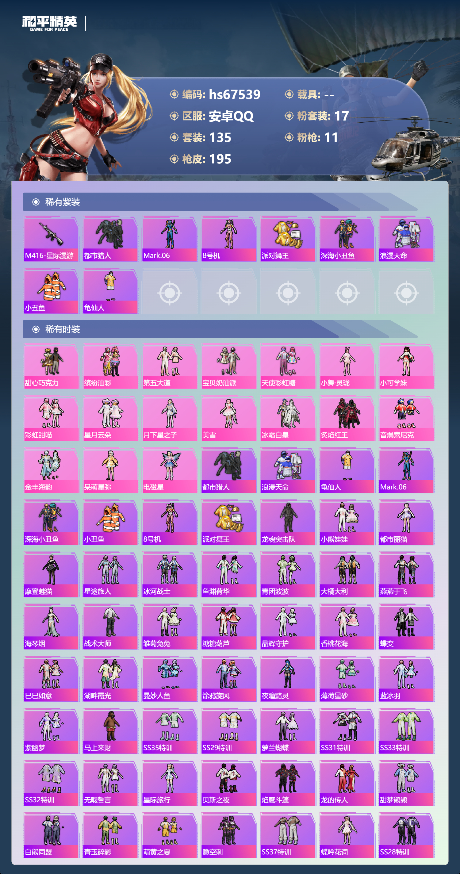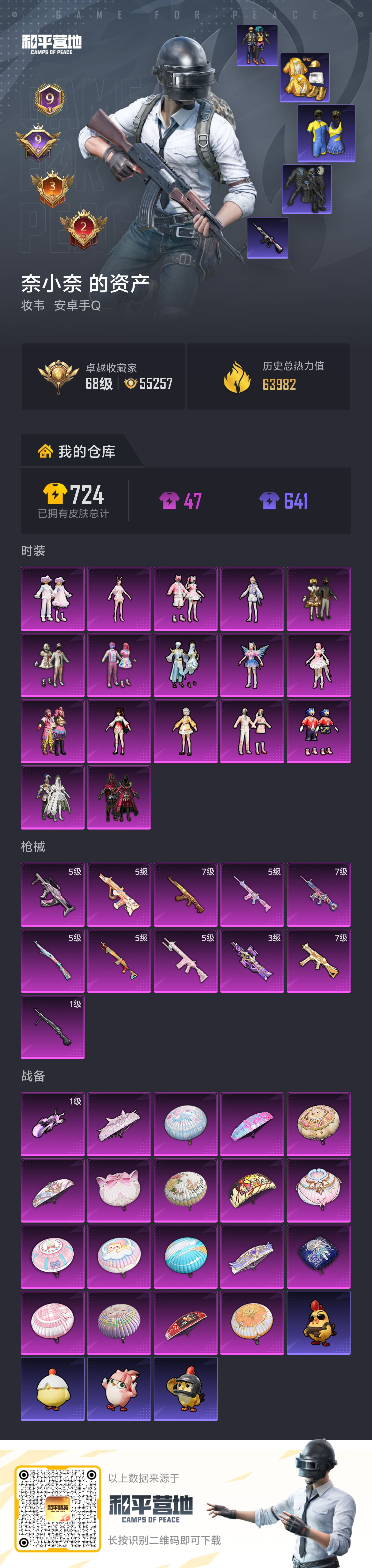 hs67539 安卓手Q-9王牌印记-17粉装-11特效枪-64072热力值-135套装-195枪皮-9卓越印记-3传奇印记