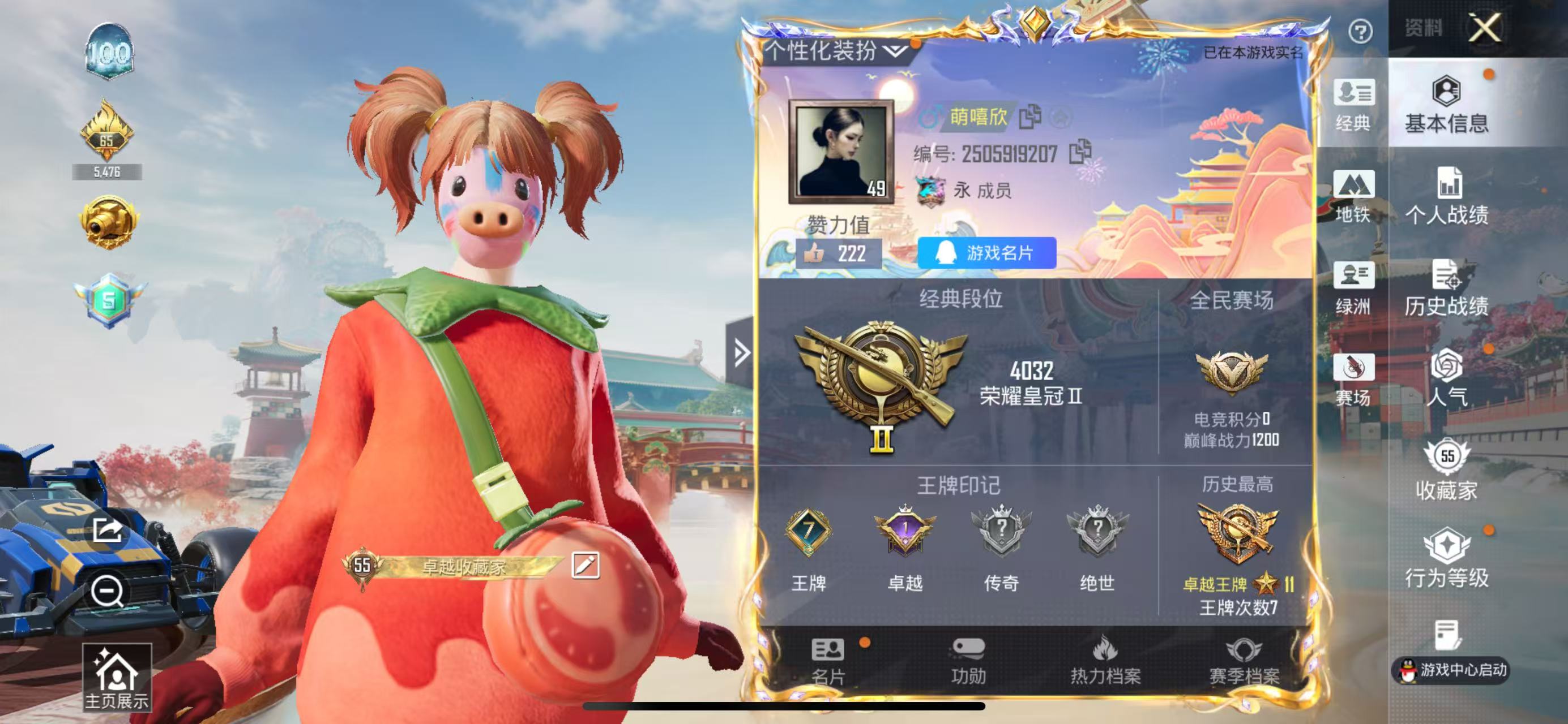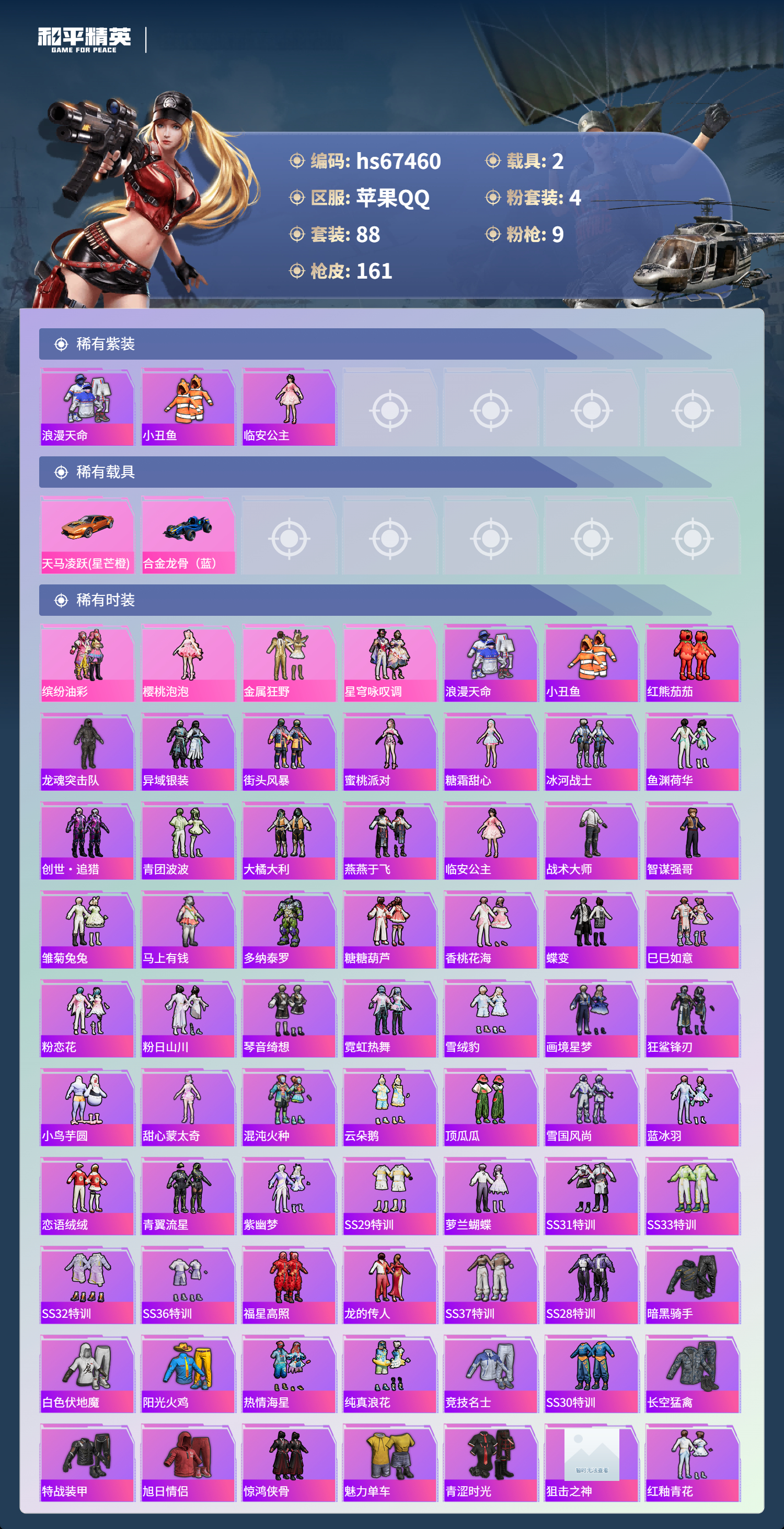hs67460 苹果手Q-7王牌印记-4粉装-9特效枪-2载具-43838热力值-88套装-161枪皮-1卓越印记