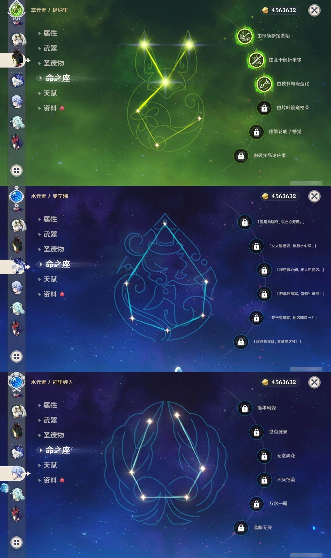 0命阿蕾奇诺,0命闲云,0命芙宁娜,0命迪希雅,0命纳西妲,3命提纳里,0命夜兰,0命神里绫人,1命八重神子,0命雷电将军,0命枫原万叶,0命钟离,0命魈,0命可莉,2命刻晴,0命七七,2命琴,2命迪卢克,0命玛薇卡,精1裁叶萃光,精1护摩之杖,精1四风原典,精1天空之刃,精1狼的末路