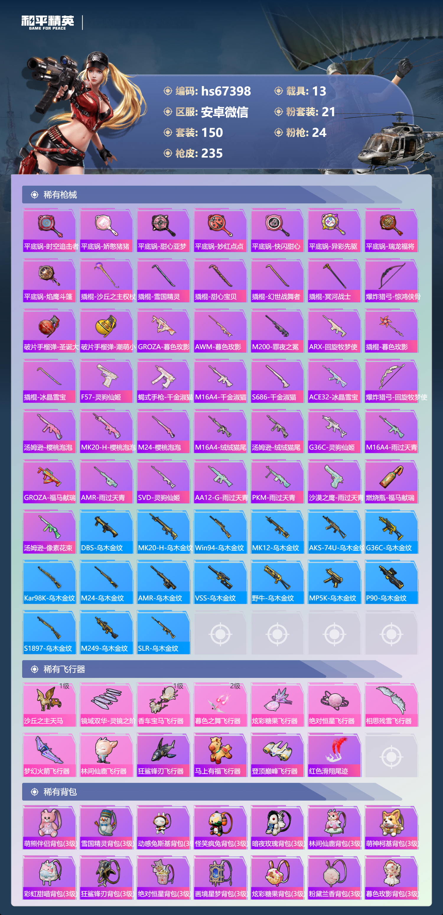 hs67398 安卓微信-19王牌印记-有战神框-3红装-21粉装-24特效枪-13载具-热力值-150套装-235枪皮-8卓越印记-8传奇印记