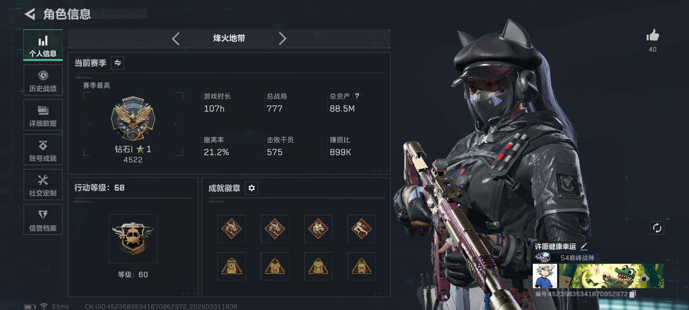 {特价出售}等级:60总资产:88.5M 纯币 12203k隐藏挂饰:毁灭之源2s 红皮:天际线 蚀金玫瑰 壮志凌云 刀皮 怜悯 砖皮: k416命运优品c 特勤处:仓库8,训练7,靶场7