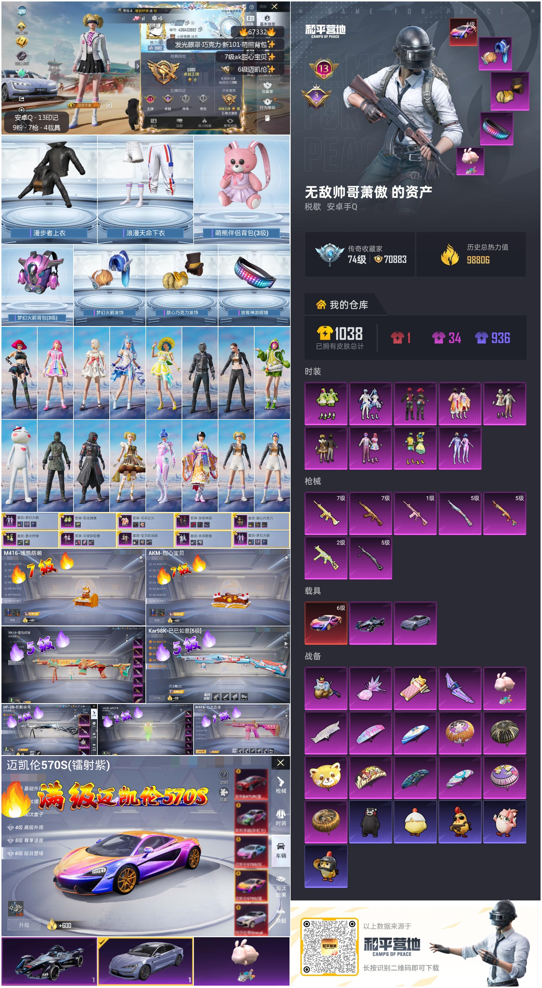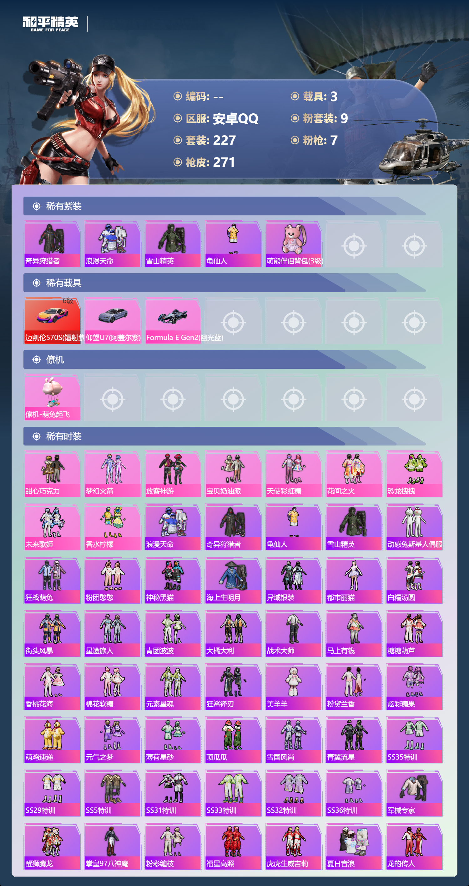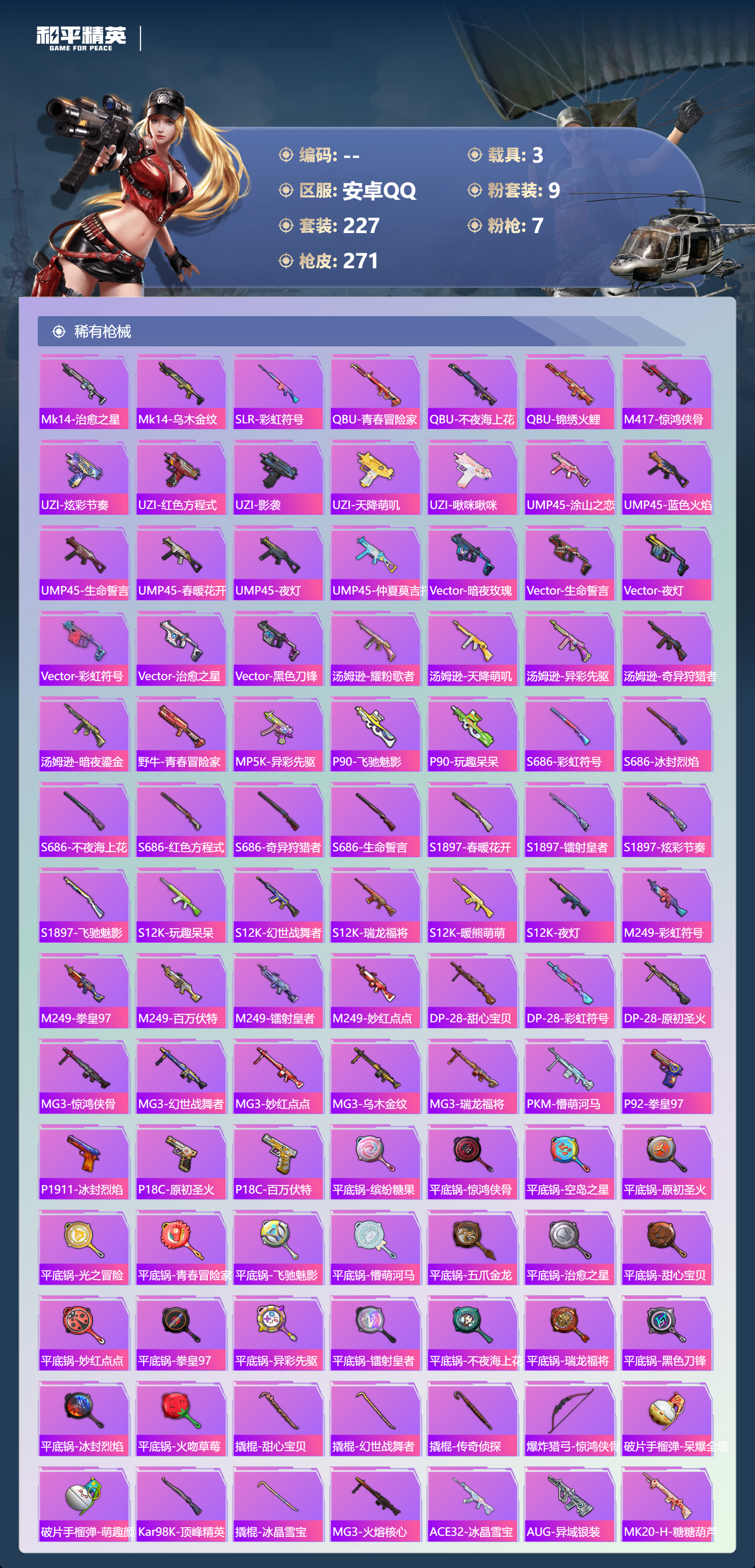 hs67332 安卓手Q-13王牌印记-9粉装-7特效枪-3载具-98806热力值-227套装-271枪皮-3卓越印记