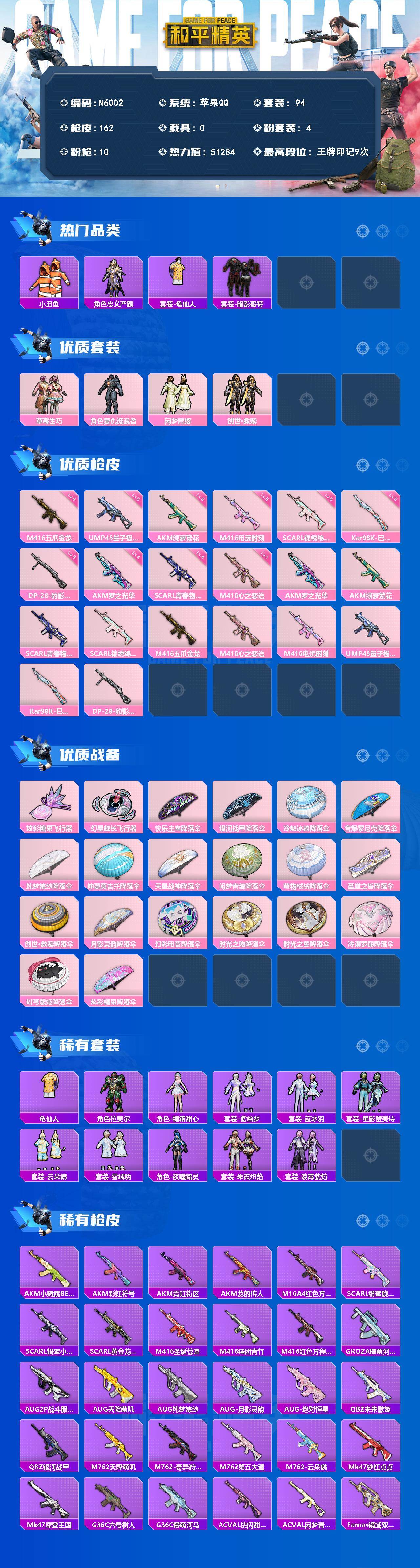 苹果 手Q-4粉装-10特效枪-0载具-2粉色飞行器-51284热力值-9王牌印记-94套装-162枪皮