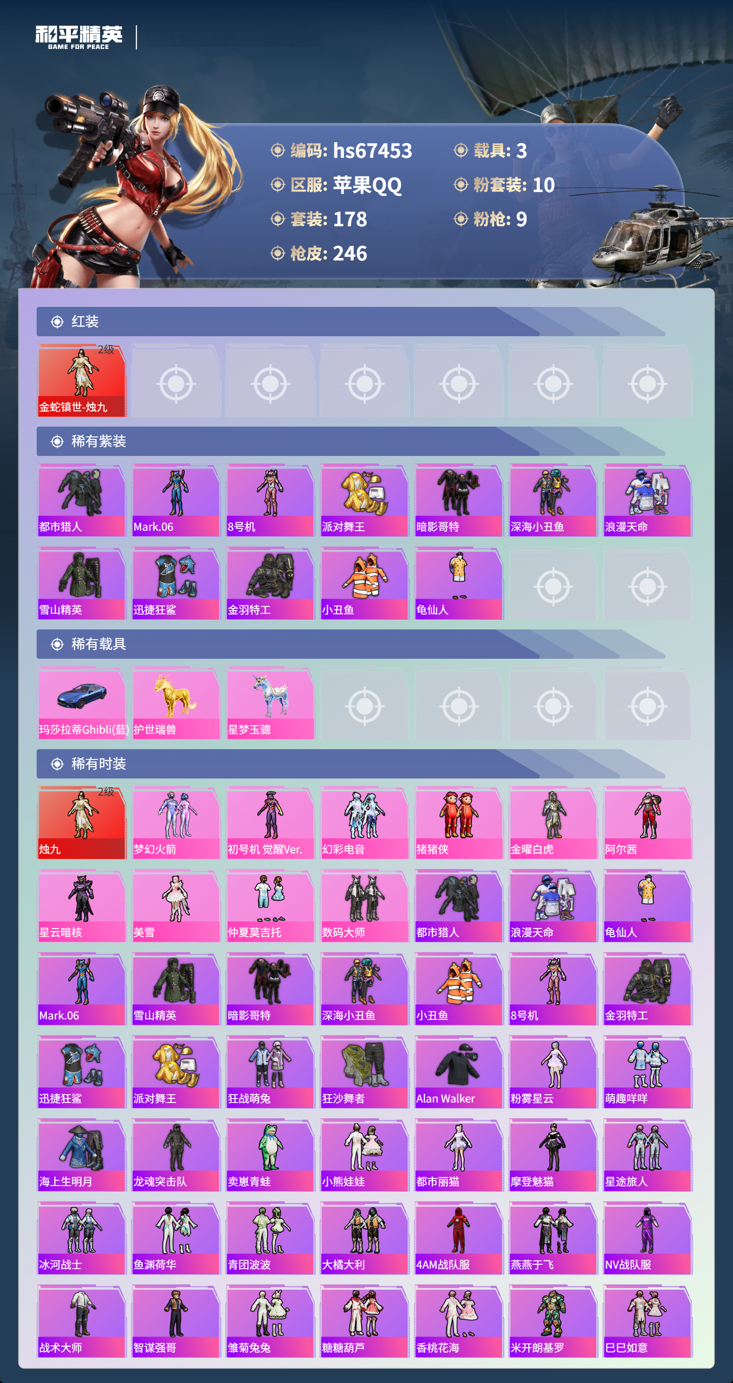 hs67453 苹果手Q-18王牌印记-有战神框-1红装-10粉装-9特效枪-3载具-87817热力值-178套装-246枪皮-8卓越印记-7传奇印记