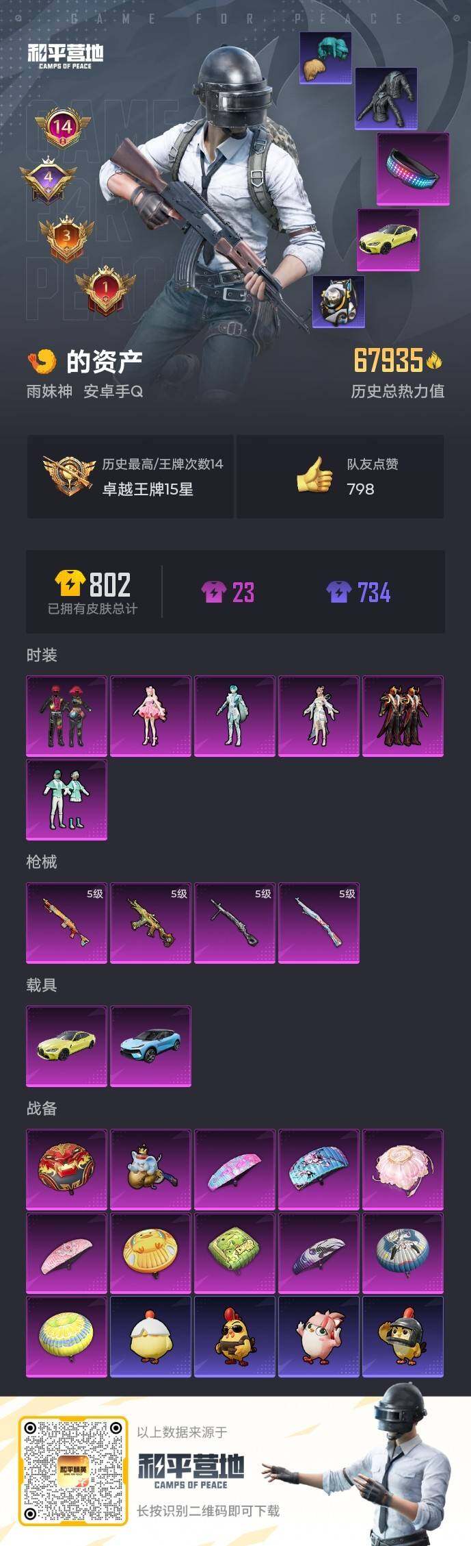 【HP4141】184套装/枪械4/装备236/载具2/战备158/王牌印记14/热力值67935/五级AKS-74U-森灵之息/五级Kar98K-巳巳如意/五级Mk14-福马献瑞/五级DP-28-豹影疾电/套装-浪漫天命/套装-都市猎人/套装-深海小丑鱼/套装-奇异狩猎者/套装-龟仙人/粉装-放客神游/粉装-薄荷物语/粉装-炙焰牛王/角色-月影灵韵/角色-玄冥寒域/角色-樱桃泡泡/路特斯ELETRE(冰川蓝)/宝马M4(圣保罗黄)/AKS-74U-森灵之息/Kar98K-巳巳如意/Mk14-福
