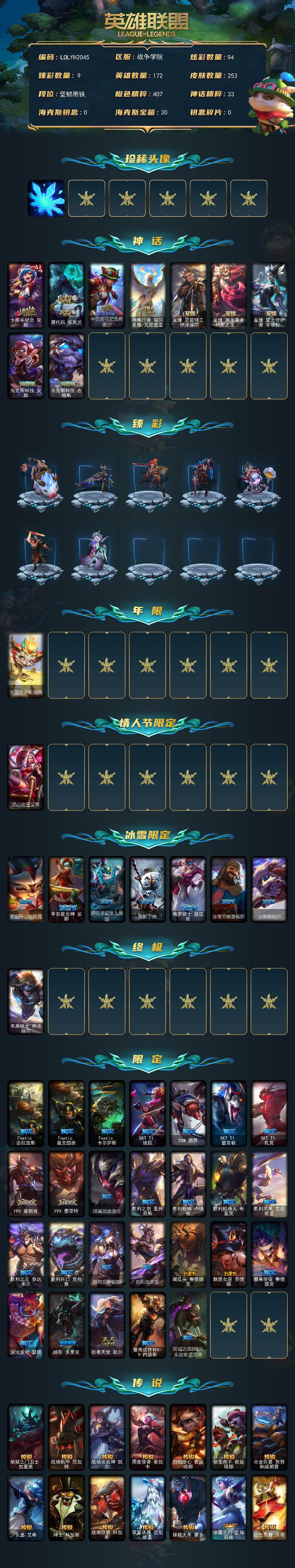 未定级段位-172英雄-253皮肤-94炫彩-1终极-9神话-35限定-34传说-54史诗