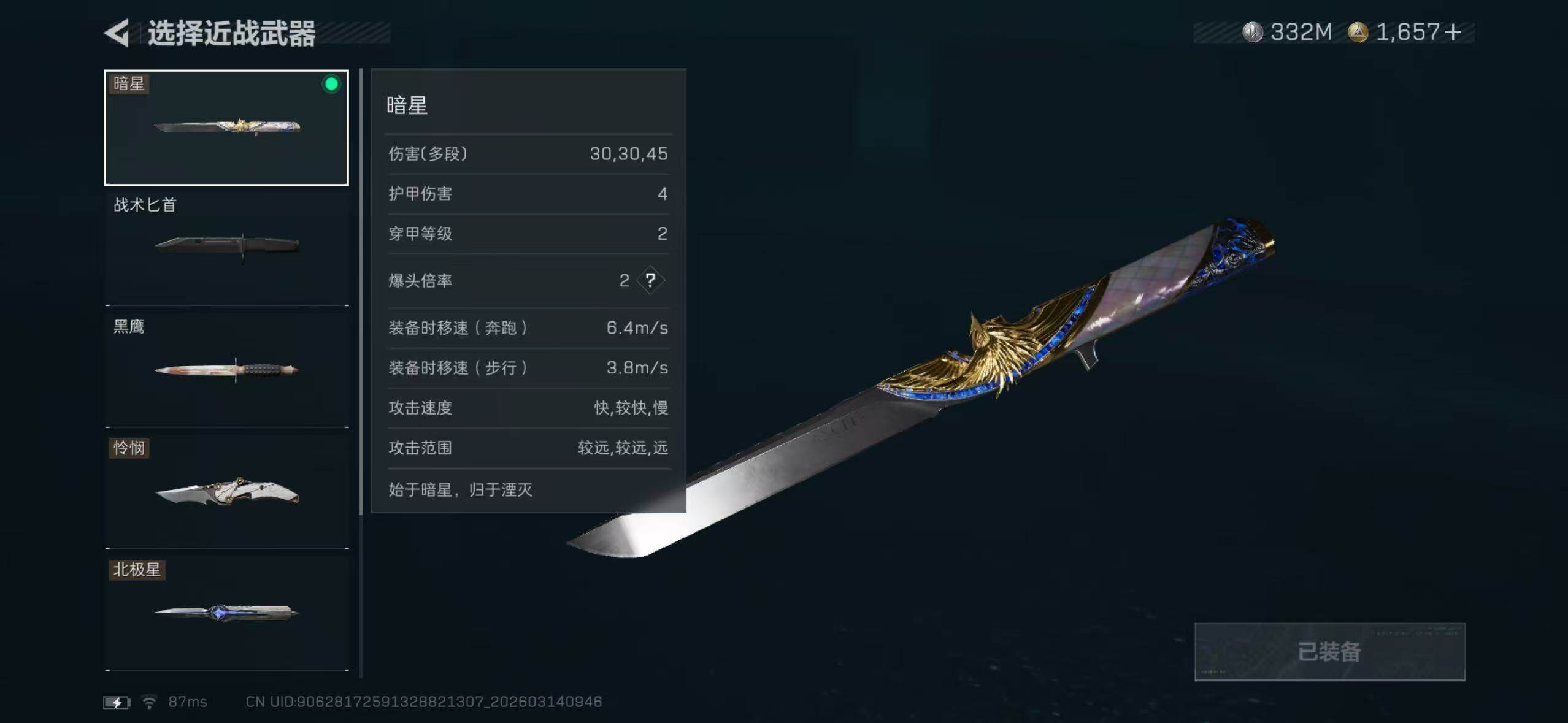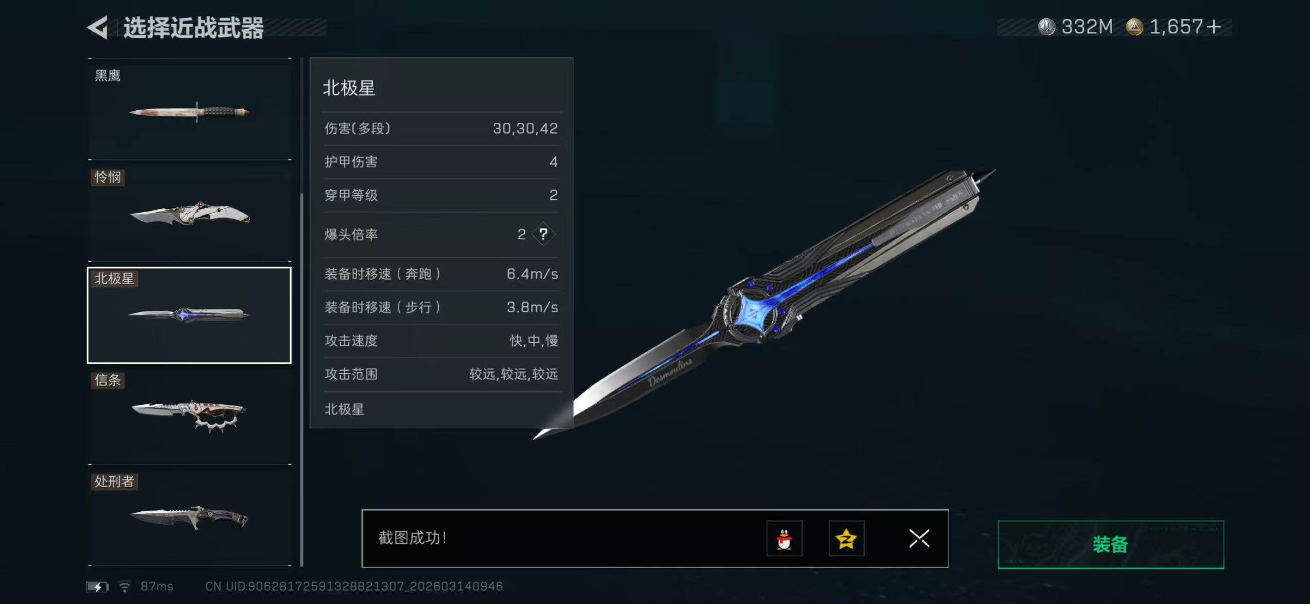 【近战皮肤】:近战-暗星,近战-北极星,近战-信条,近战-怜悯,近战-处刑者1级,近战-黑鹰