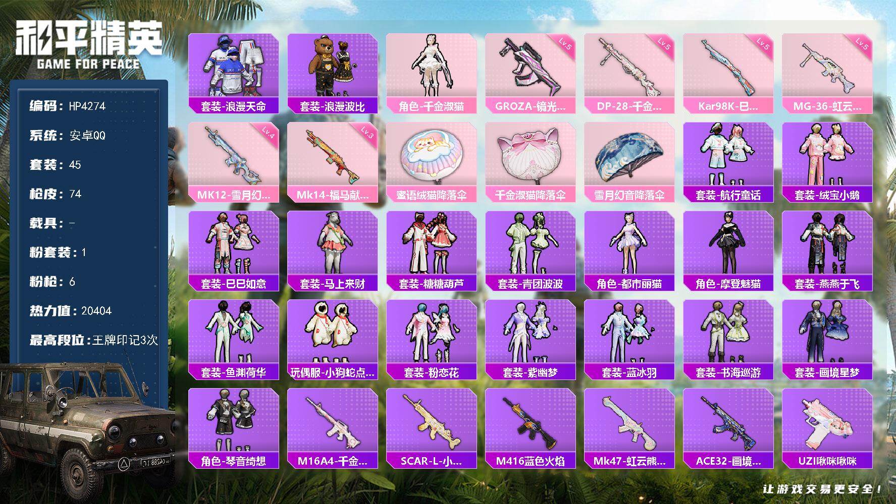 安卓 手Q-1粉装-6特效枪-0载具-0粉色飞行器-20404热力值-3王牌印记-45套装-74枪皮