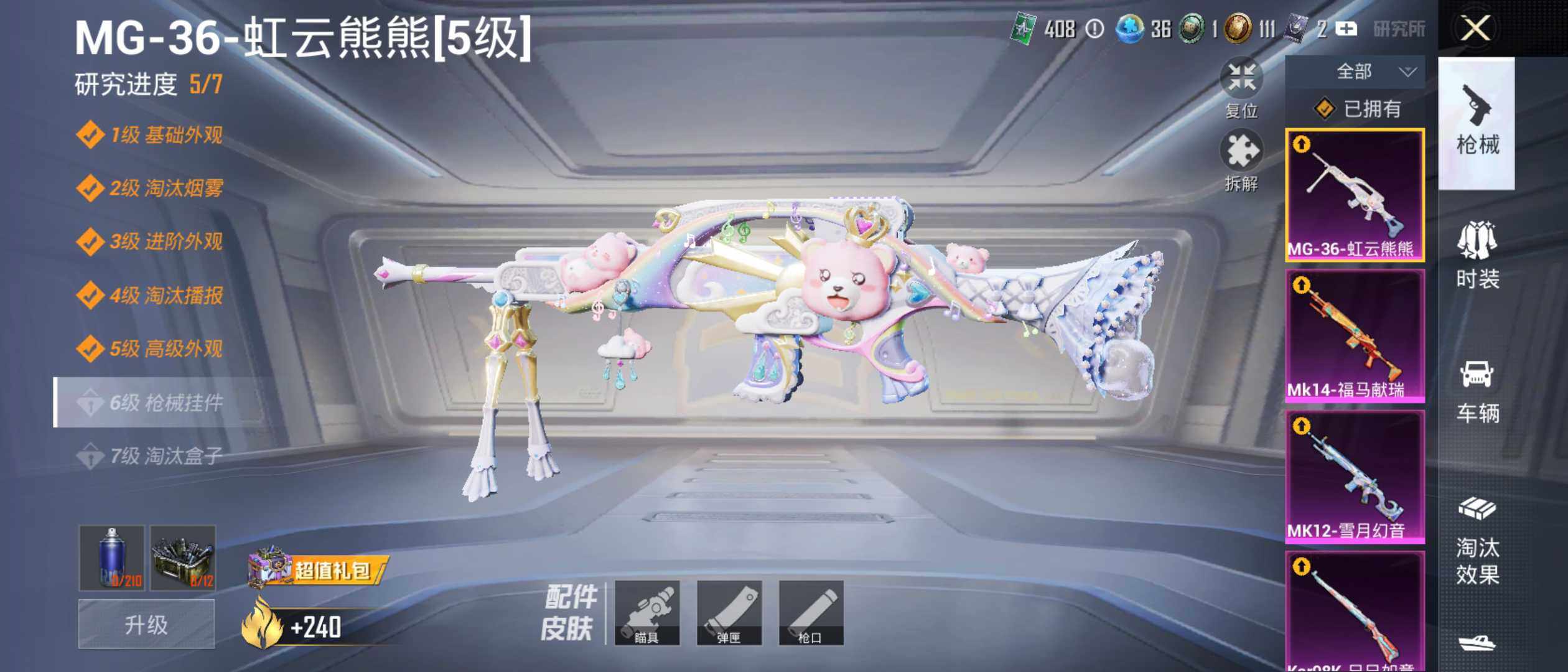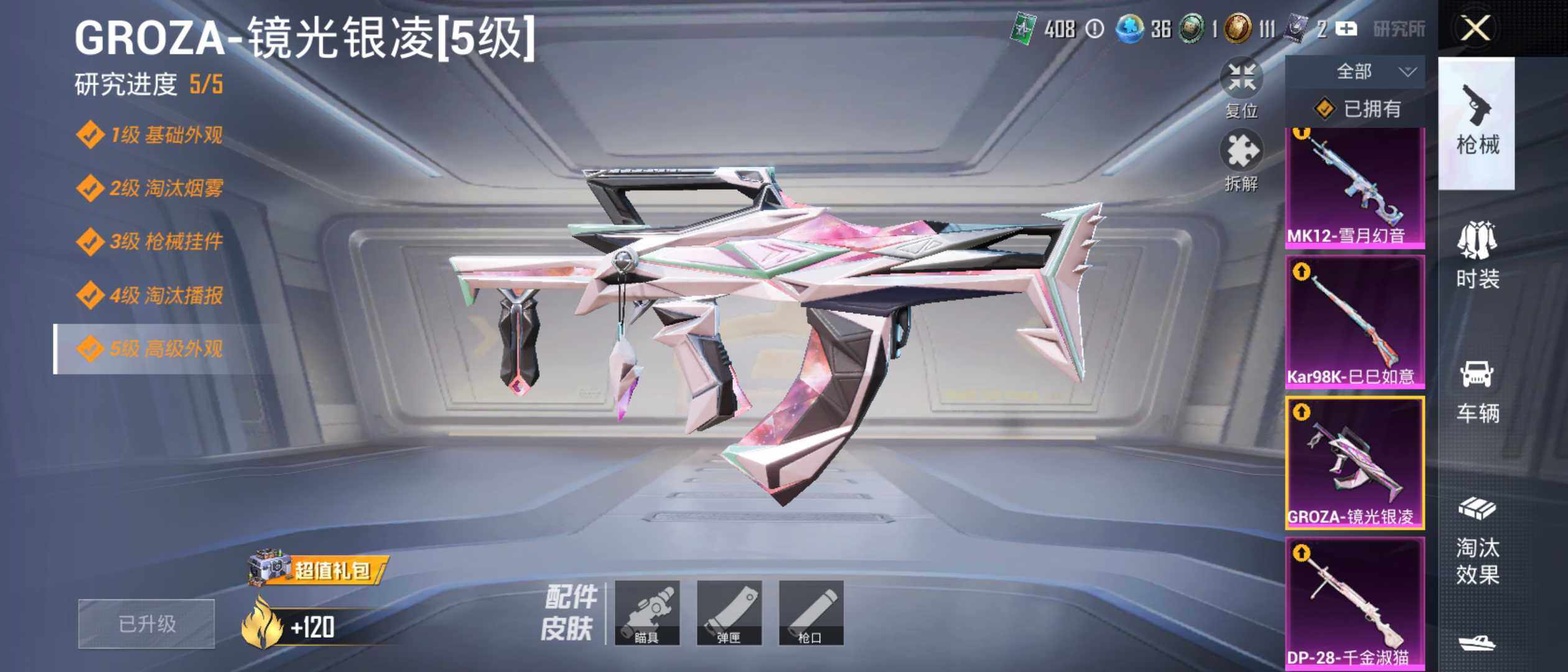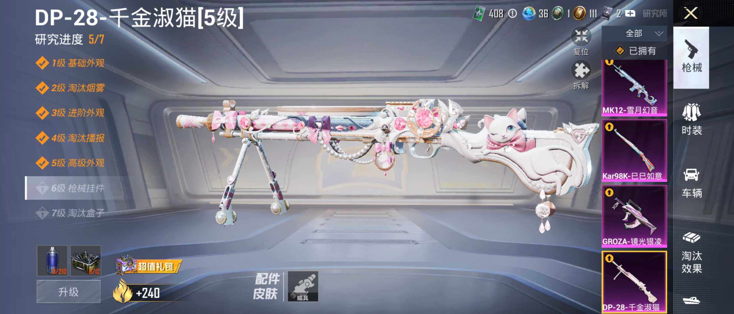 【粉色枪皮等级】:GROZA-镜光银凌(五级),Kar98K-巳巳如意(五级),Mk14-福马献瑞(三级),MK12-雪月幻音(四级),DP-28-千金淑猫(五级),MG-36-虹云熊熊(五级)