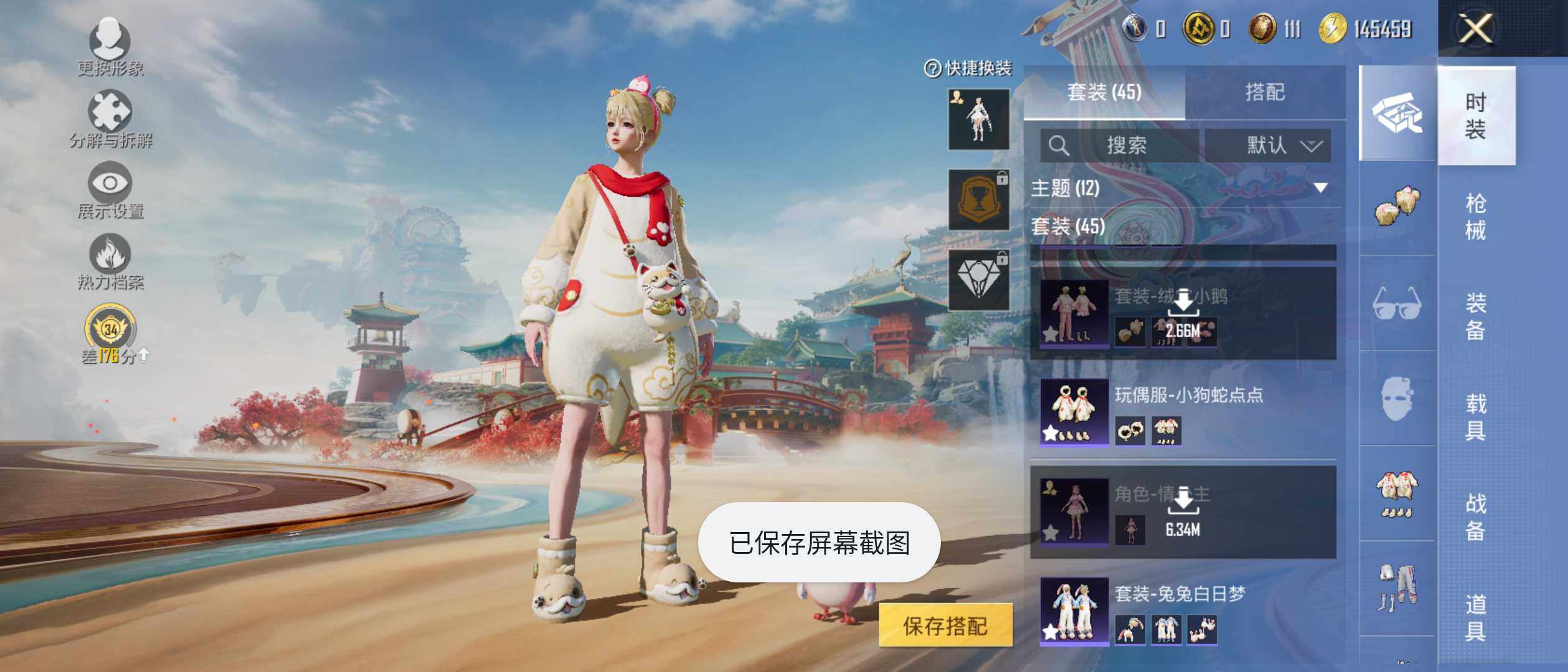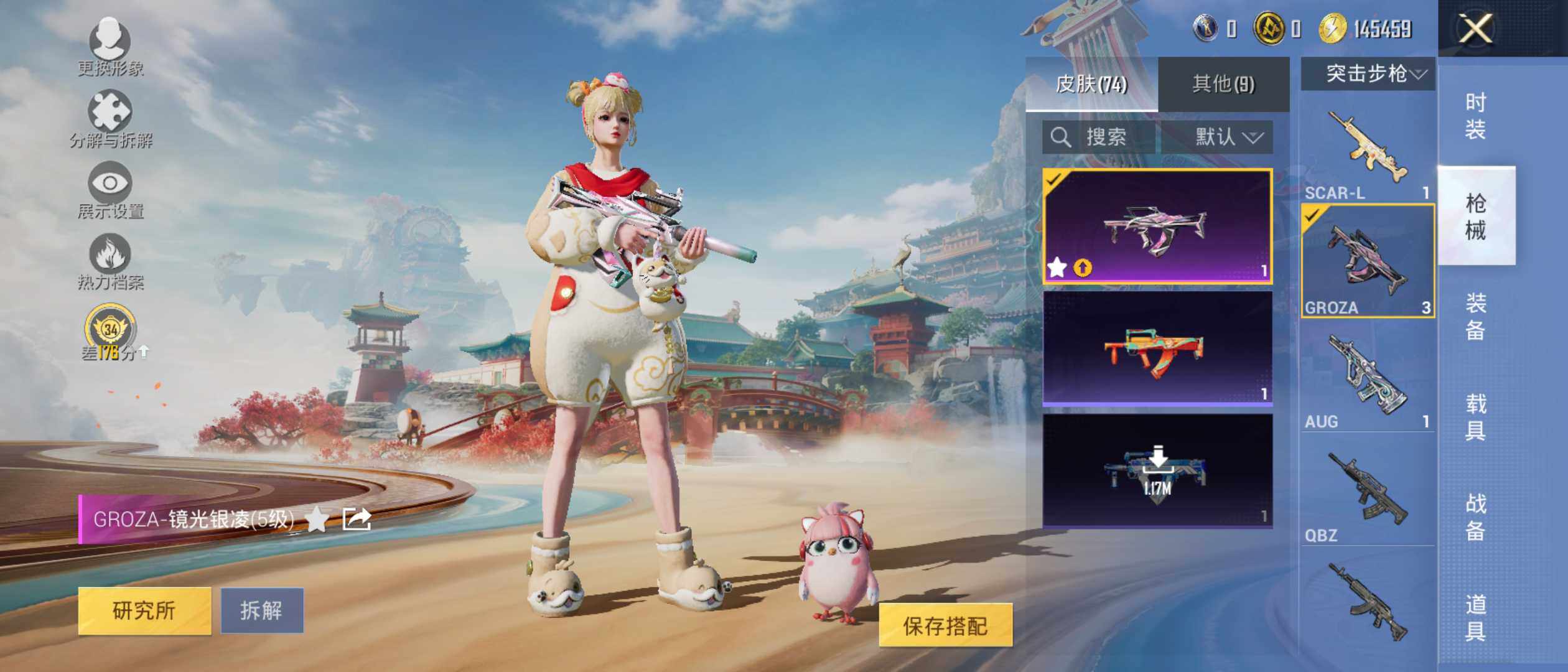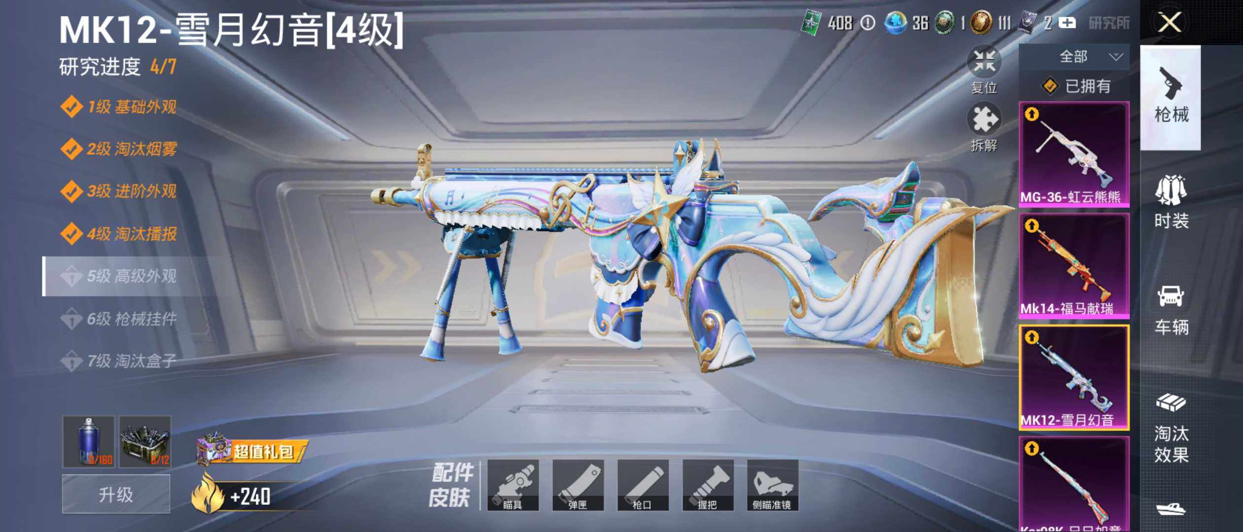 【粉色枪皮等级】:GROZA-镜光银凌(五级),Kar98K-巳巳如意(五级),Mk14-福马献瑞(三级),MK12-雪月幻音(四级),DP-28-千金淑猫(五级),MG-36-虹云熊熊(五级)