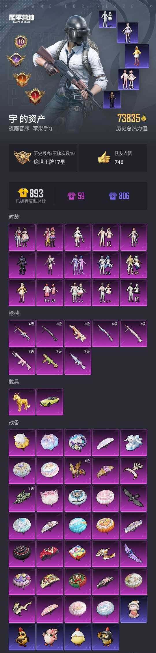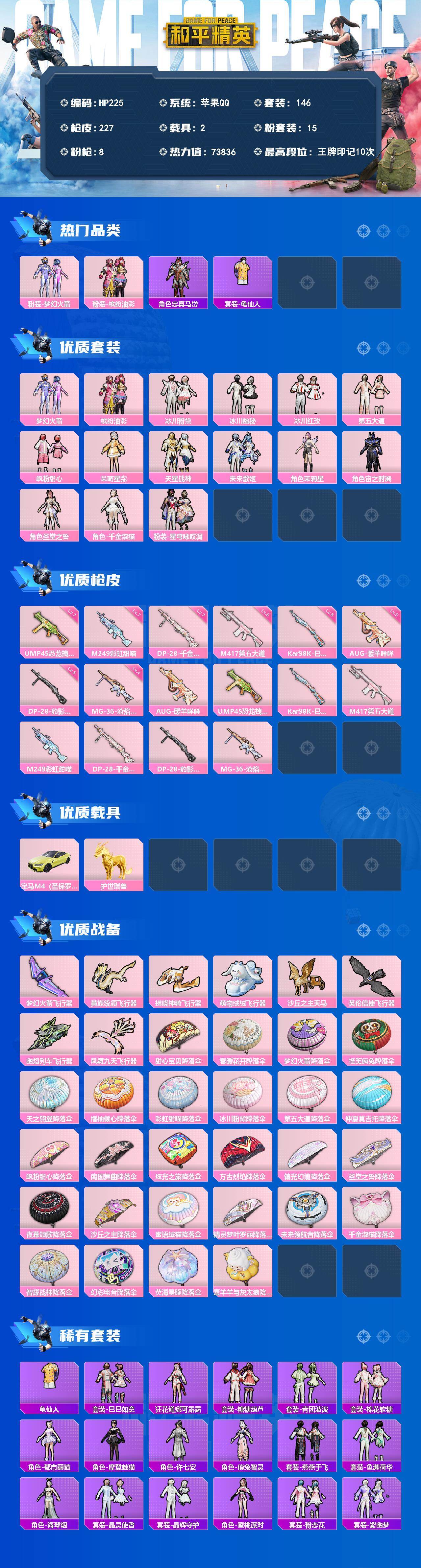 【秒换绑】苹果 手Q-15粉装-8特效枪-2载具-8粉色飞行器-73836热力值-10王牌印记-146套装-227枪皮