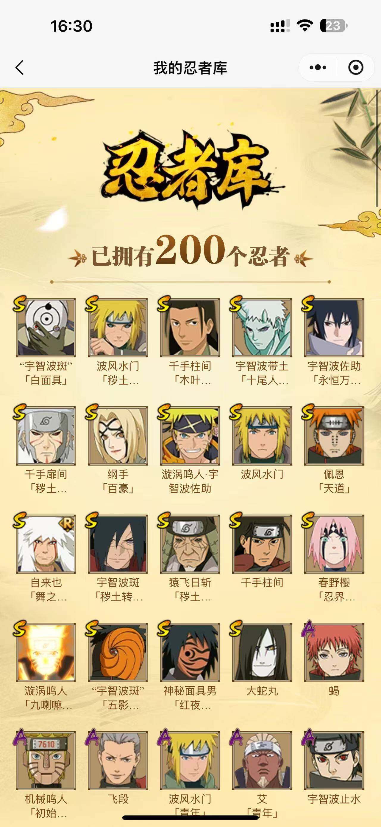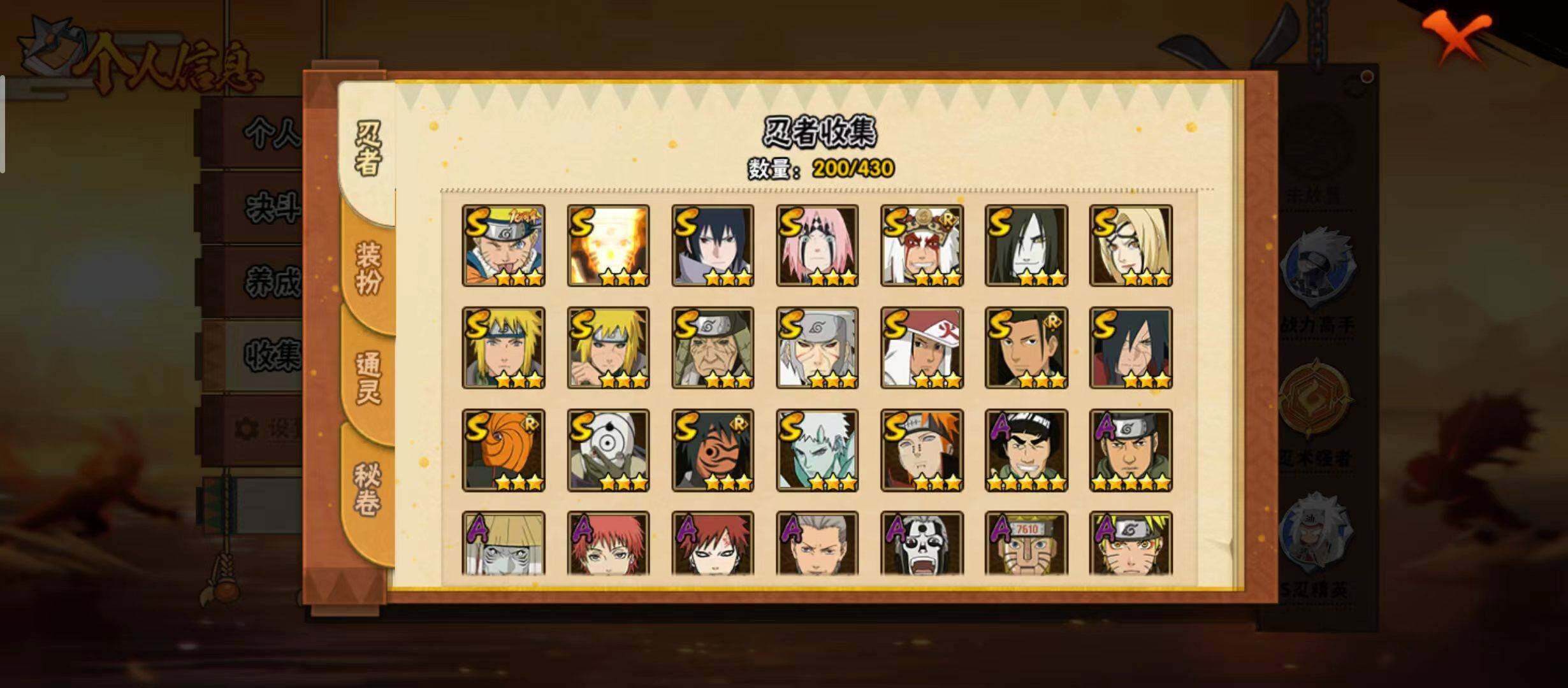 可改实名*19S级忍者数-38A级忍者数【S级忍者】:猿飞日斩「秽土转生」(3星),波风水门「秽土转生」(3星),千手扉间「秽土转生」(3星),宇智波斑「秽土转生·解」(3星),春野樱「忍界大战」(3星),千手柱间「木叶创立」(3星),自来也「舞之豪杰」(3星),大蛇丸(3星),纲手「百豪」(3星),千手柱间(3星),波风水门(3星),神秘面具男「红夜之刃」(3星),漩涡鸣人「九喇嘛连结」(3星
