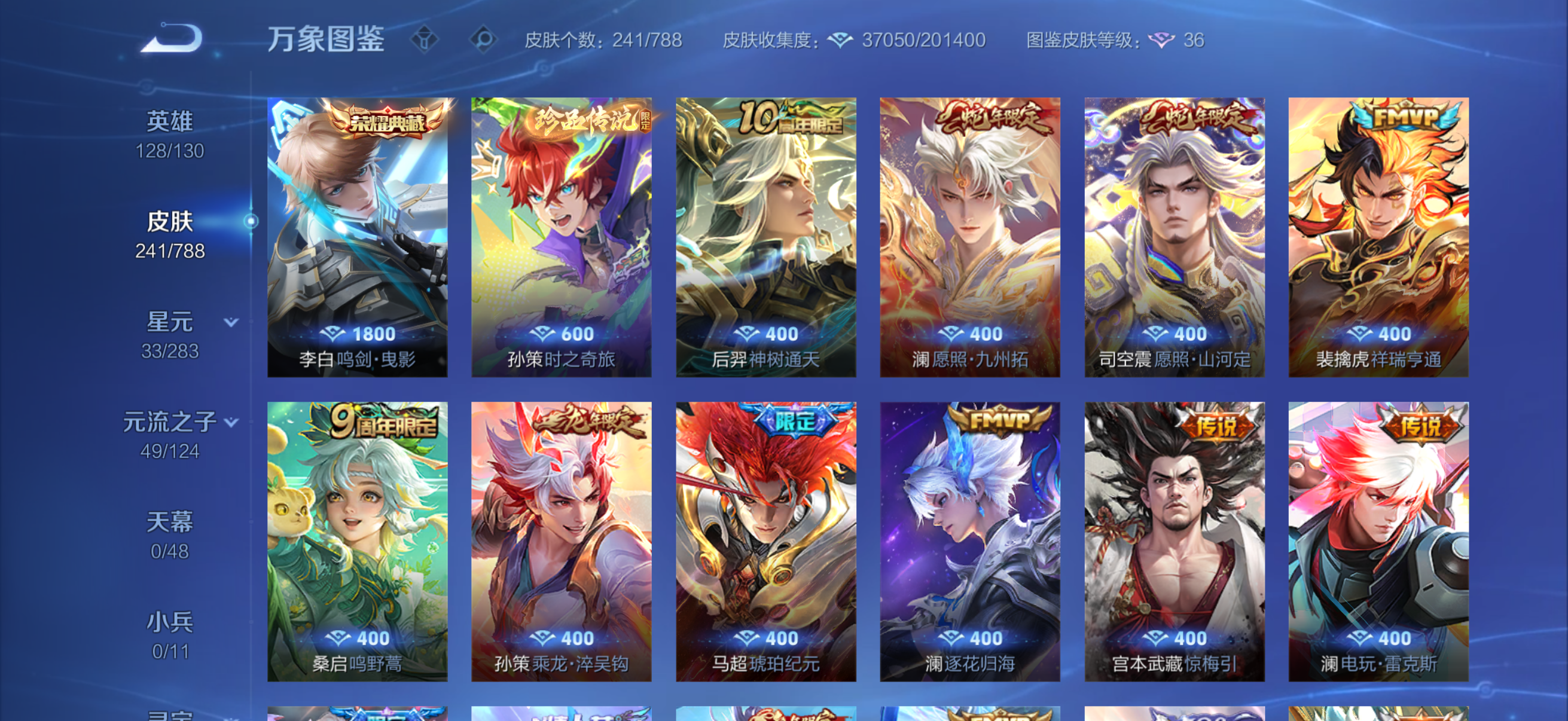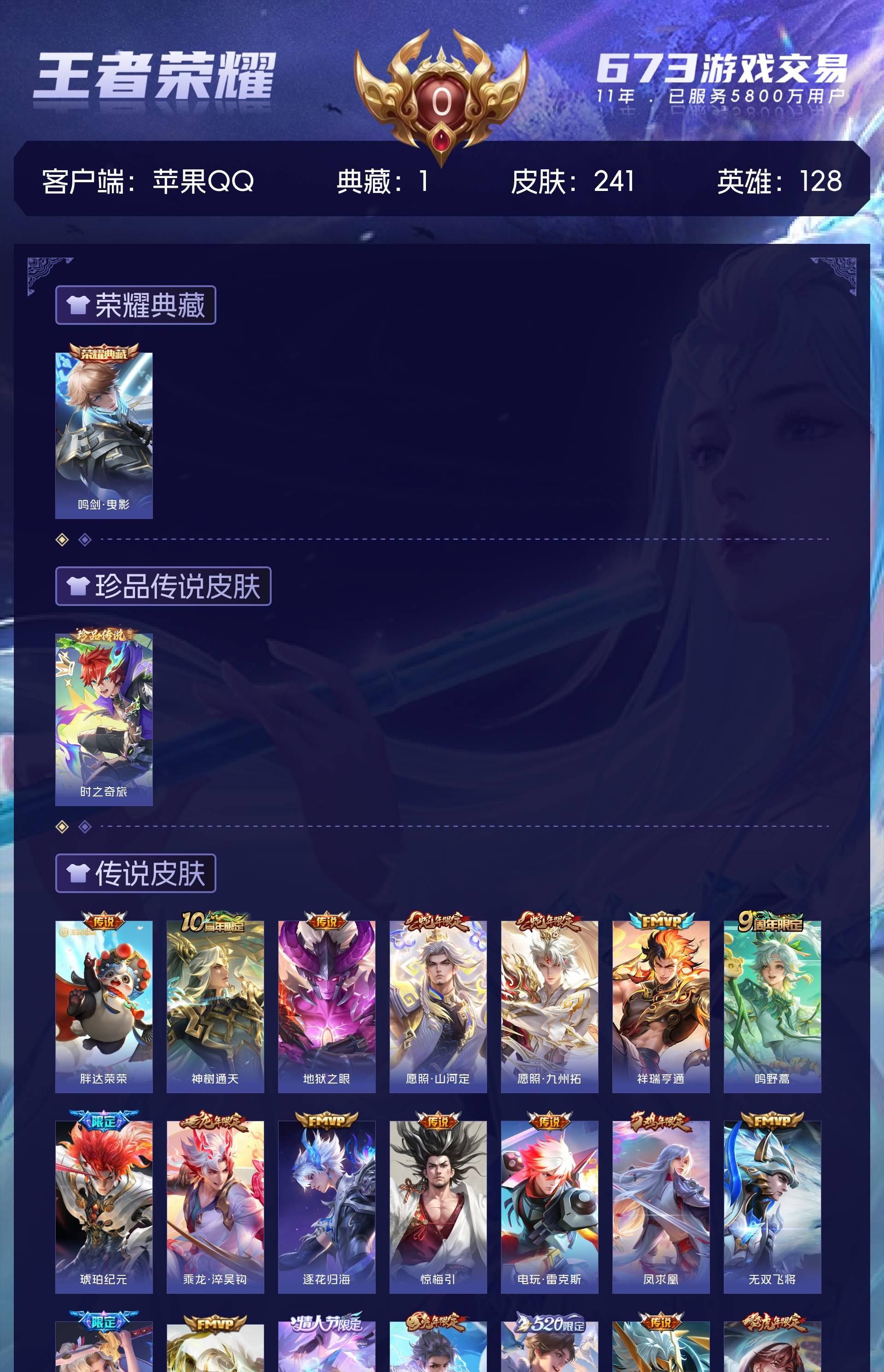 皮肤241 英雄128 永恒钻石 荣耀典藏1 珍品传说1 传说21
