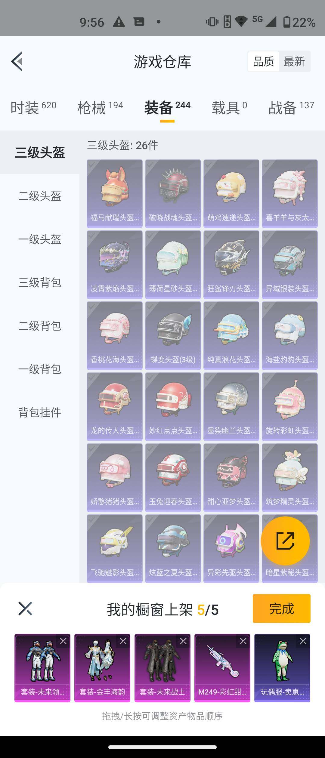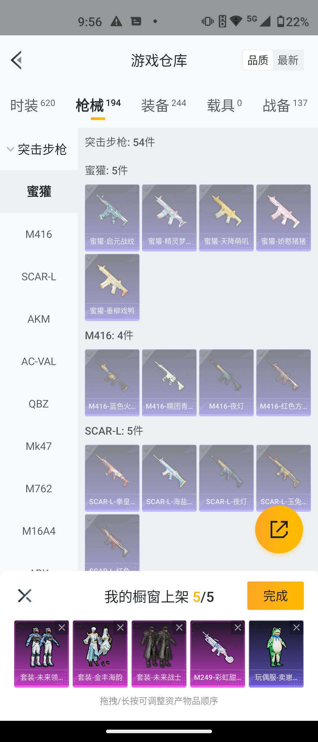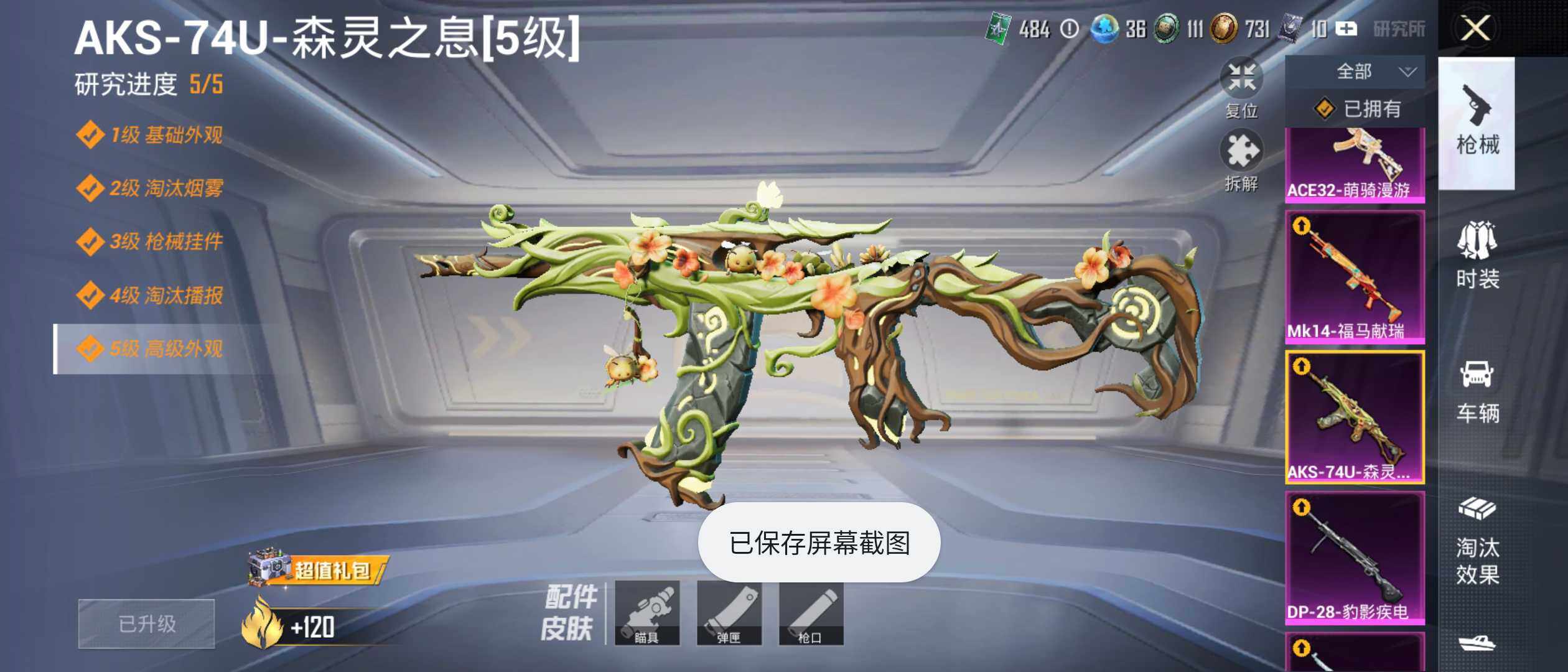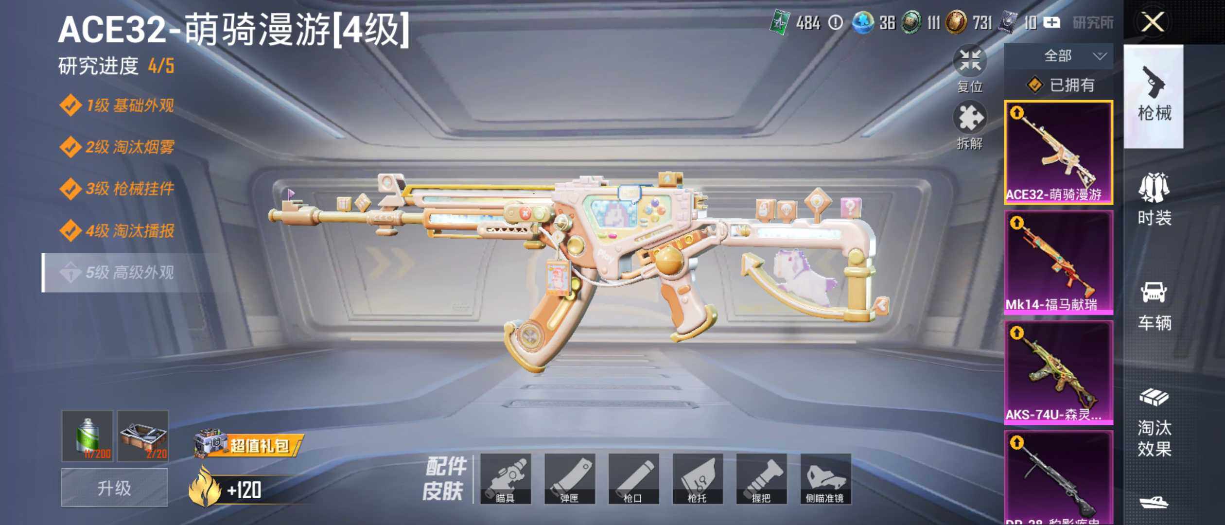 【粉色枪皮等级】:ACE32-萌骑漫游(四级),AKS-74U-森灵之息(五级),Kar98K-巳巳如意(五级),Mk14-福马献瑞(四级),M249-