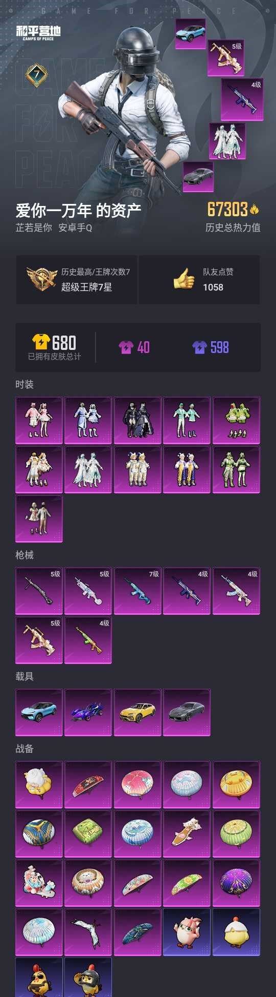 【秒换绑】安卓 手Q-11粉装-7特效枪-4载具-3粉色飞行器-67303热力值-7王牌印记-139套装-170枪皮