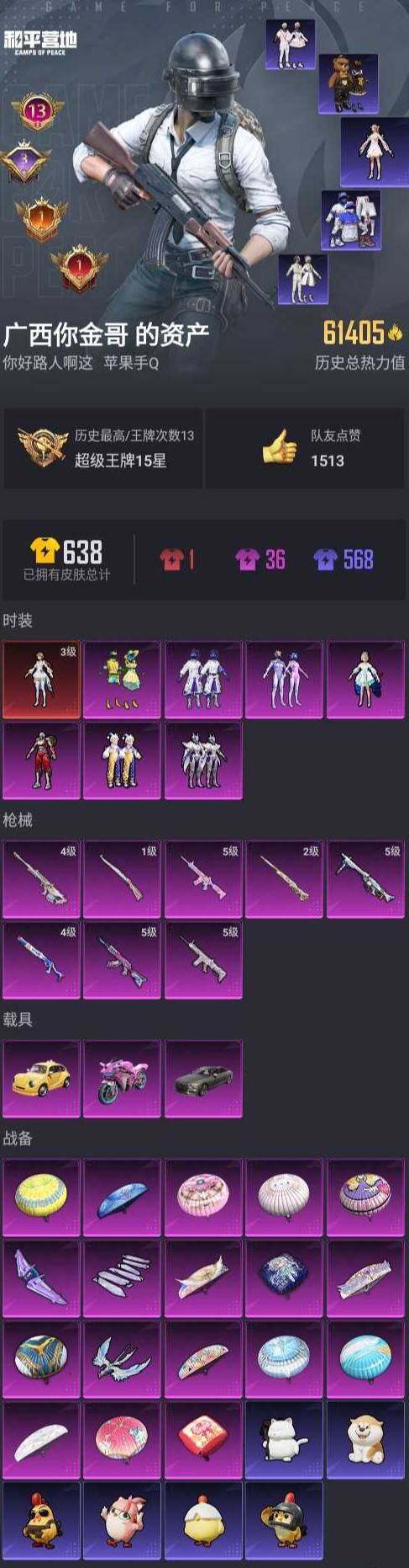 【秒换绑】苹果 手Q-1神装-7粉装-8特效枪-3载具-3粉色飞行器-61406热力值-13王牌印记-128套装-171枪皮