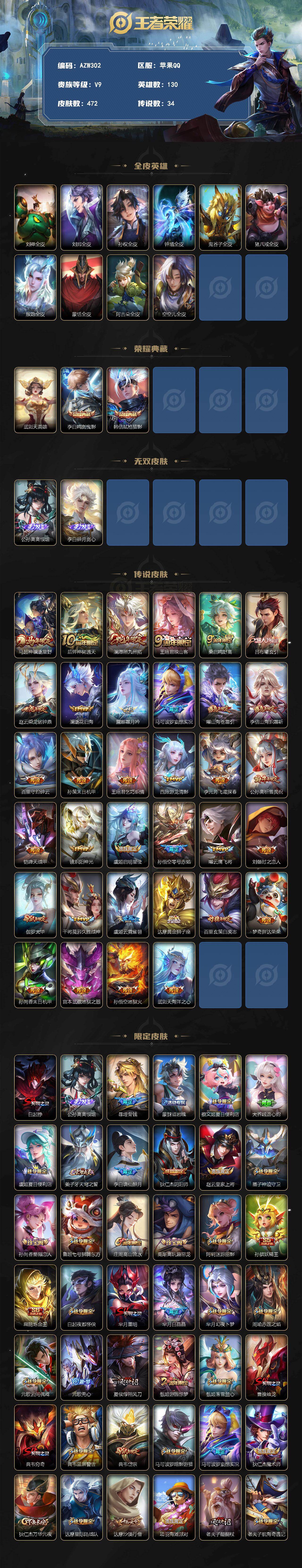 AZW302】苹果Q-V9-最强王者段位-130英雄-472皮肤-2典藏皮肤-1典藏英雄-2无双-34传说-137史诗