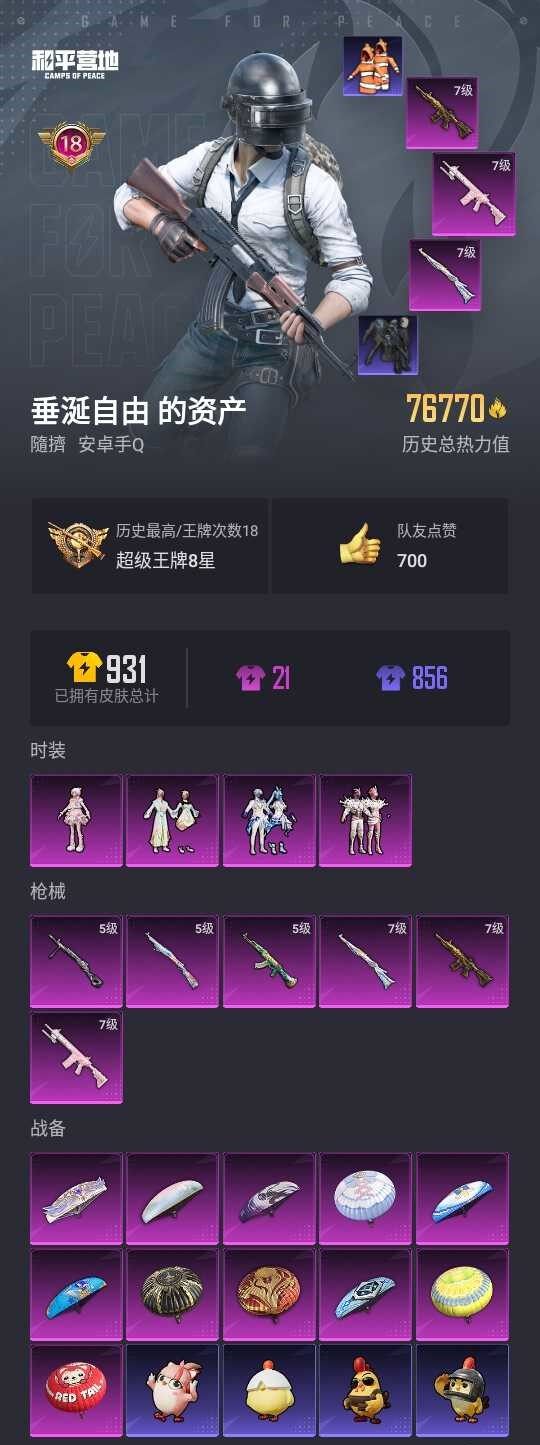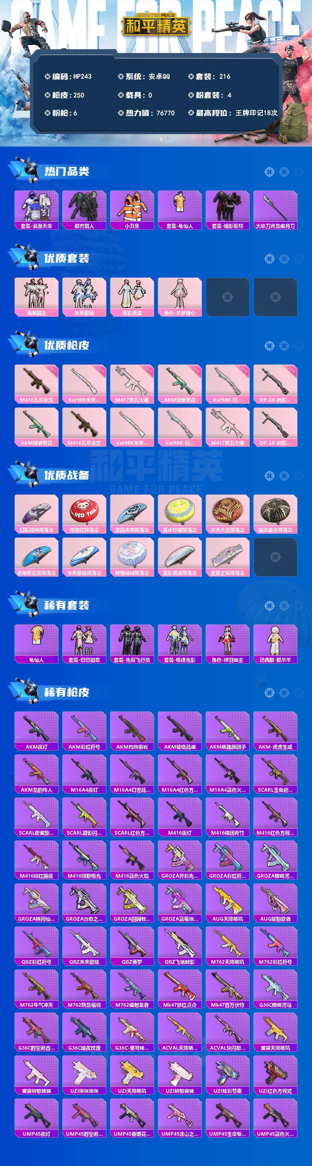 【秒换绑】安卓 手Q-4粉装-6特效枪-0载具-0粉色飞行器-76770热力值-18王牌印记-216套装-250枪皮