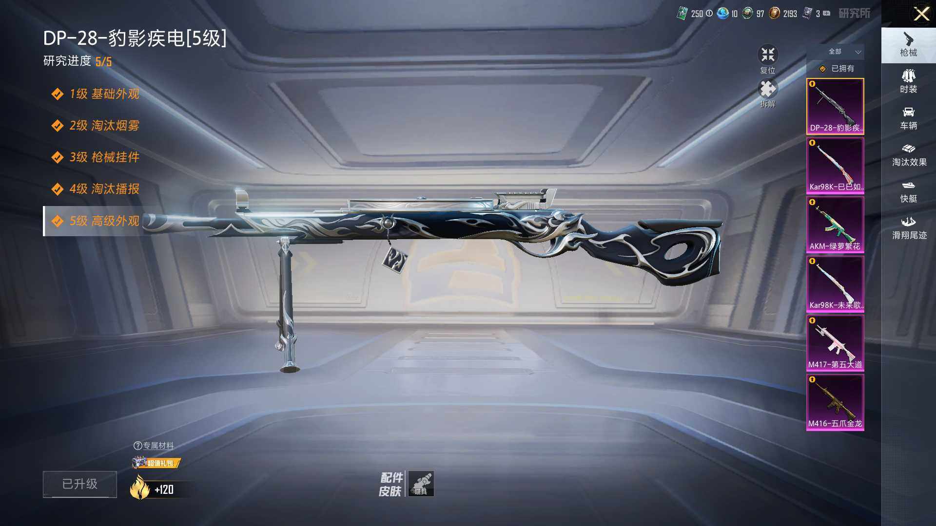【粉色枪皮等级】:AKM-绿萝繁花(五级),M416-五爪金龙(七级),Kar98K-未来歌