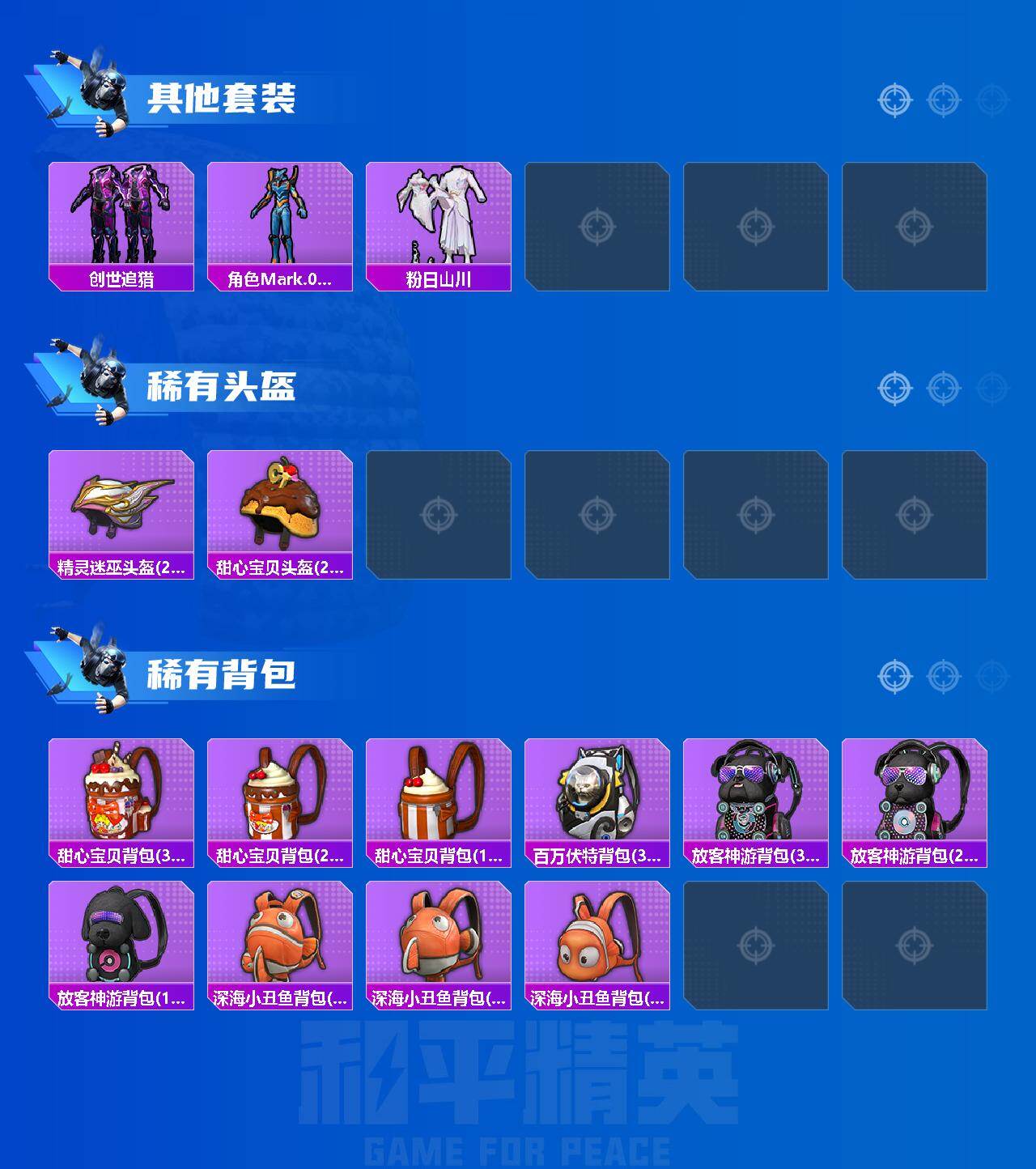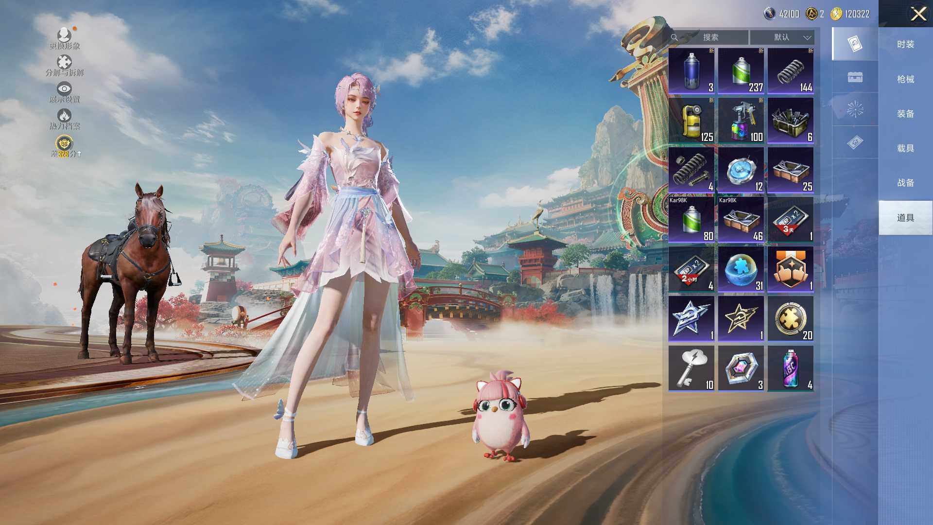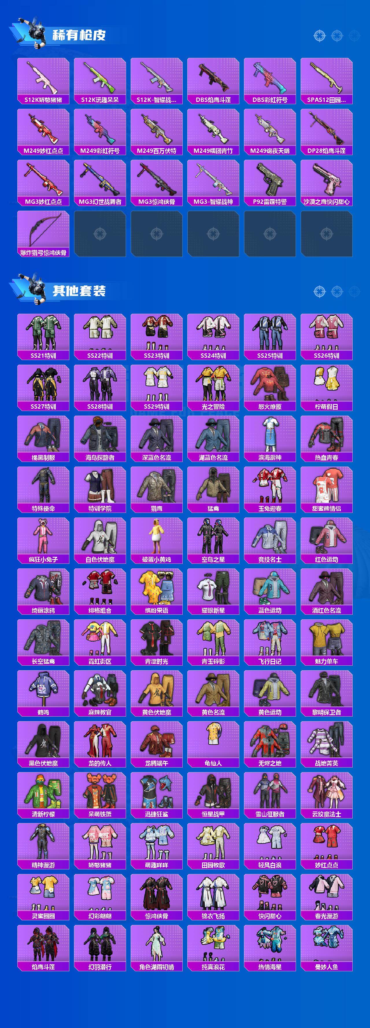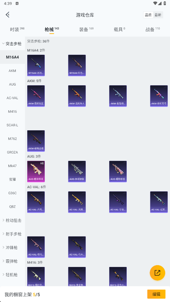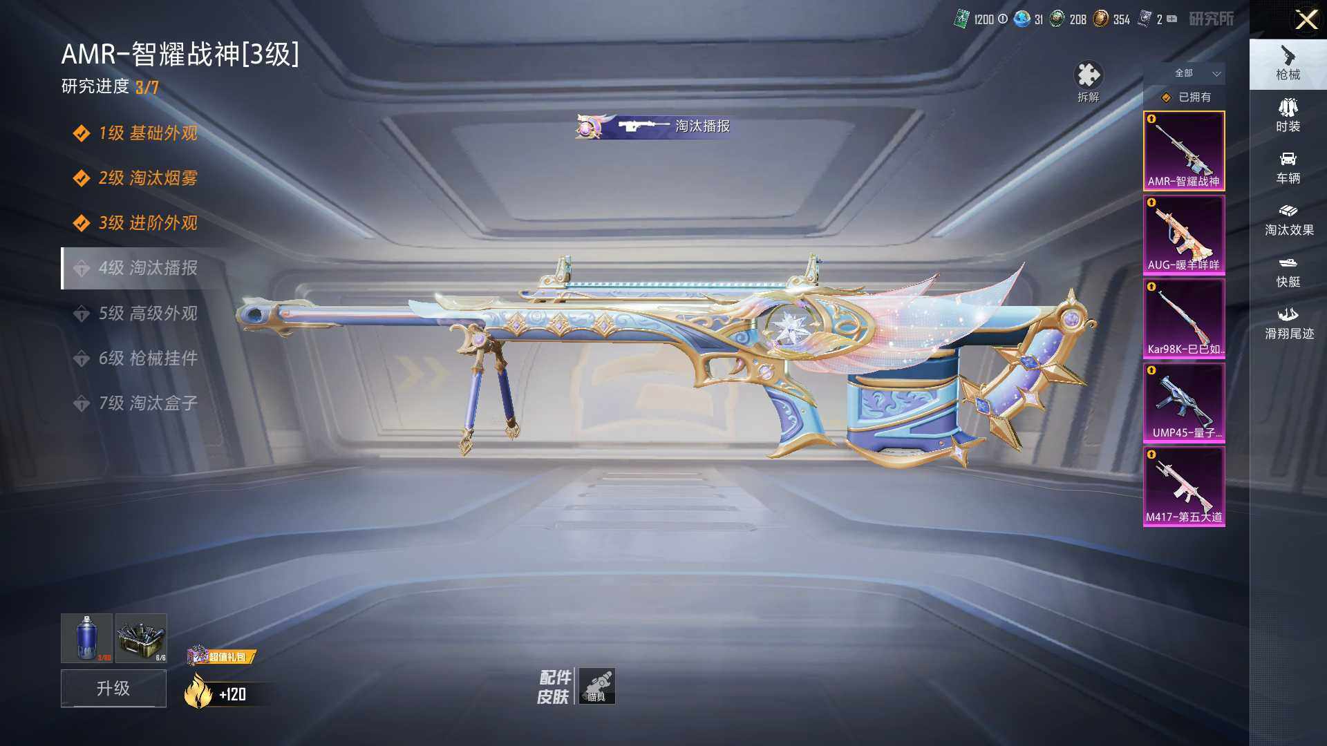 【粉色枪皮等级】:AUG-暖羊咩咩(五级),UMP45-量子极限(五级),Kar98K-巳巳如意(五级),AMR-智耀战神(三级),M417-第五大道(六级)