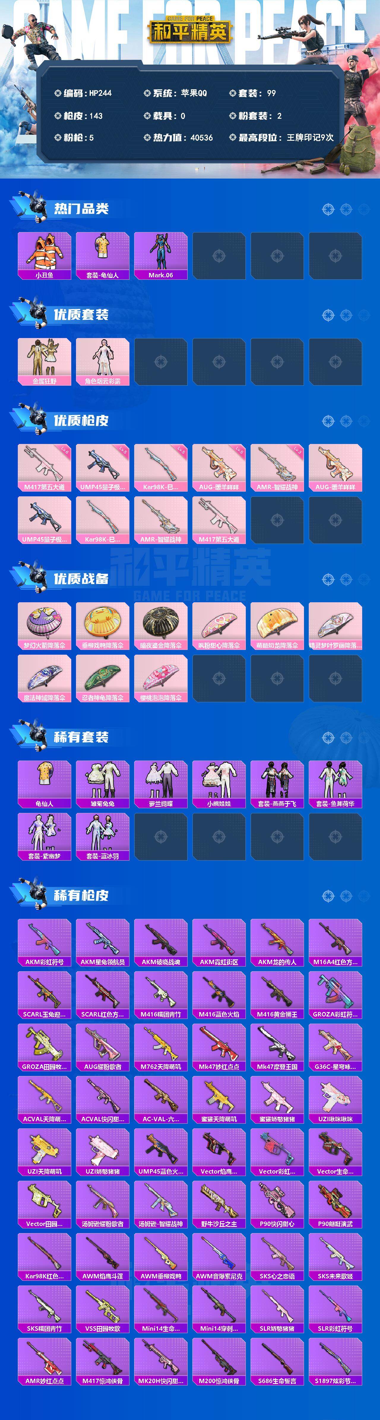 【秒换绑】苹果 手Q-2粉装-5特效枪-0载具-0粉色飞行器-40536热力值-9王牌印记-99套装-143枪皮