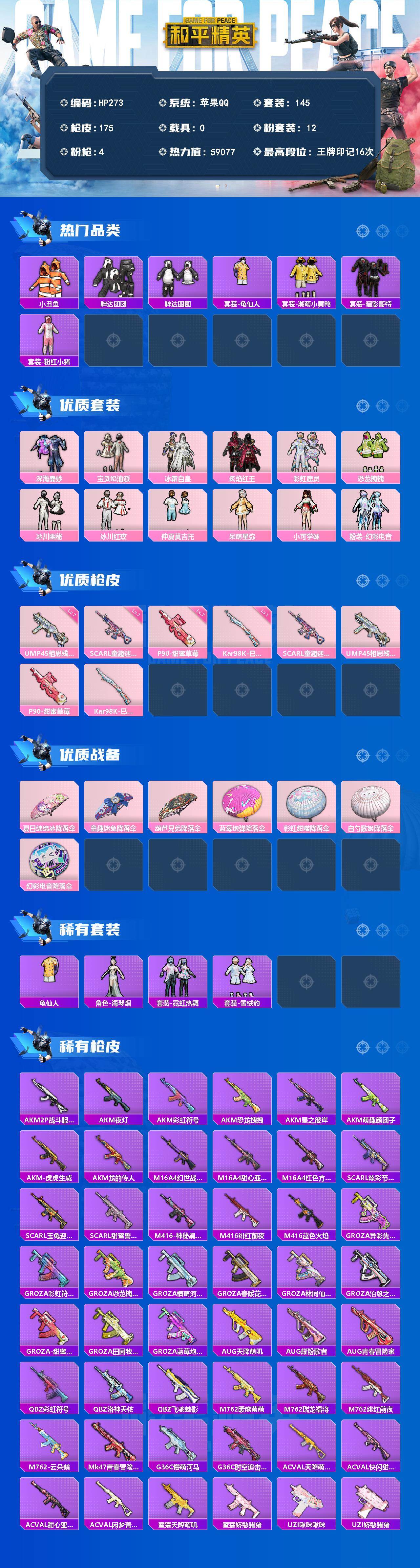 【秒换绑】苹果 手Q-12粉装-4特效枪-0载具-0粉色飞行器-59077热力值-16王牌印记-145套装-175枪皮