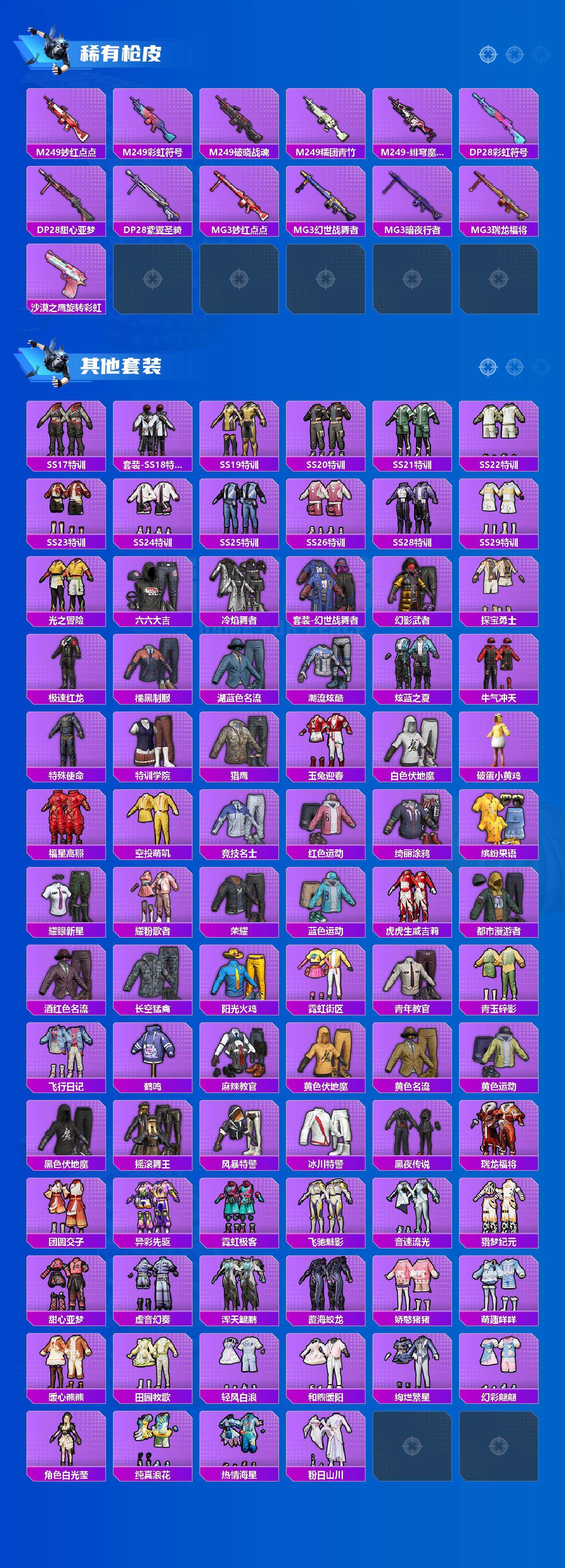 【粉色枪皮等级】:M416-电玩时刻(五级),GROZA-旋转彩虹(六级),Mk14-福马献瑞(三级),DP-28-豹影疾电(五级),MG3-炙焰牛王(五级)