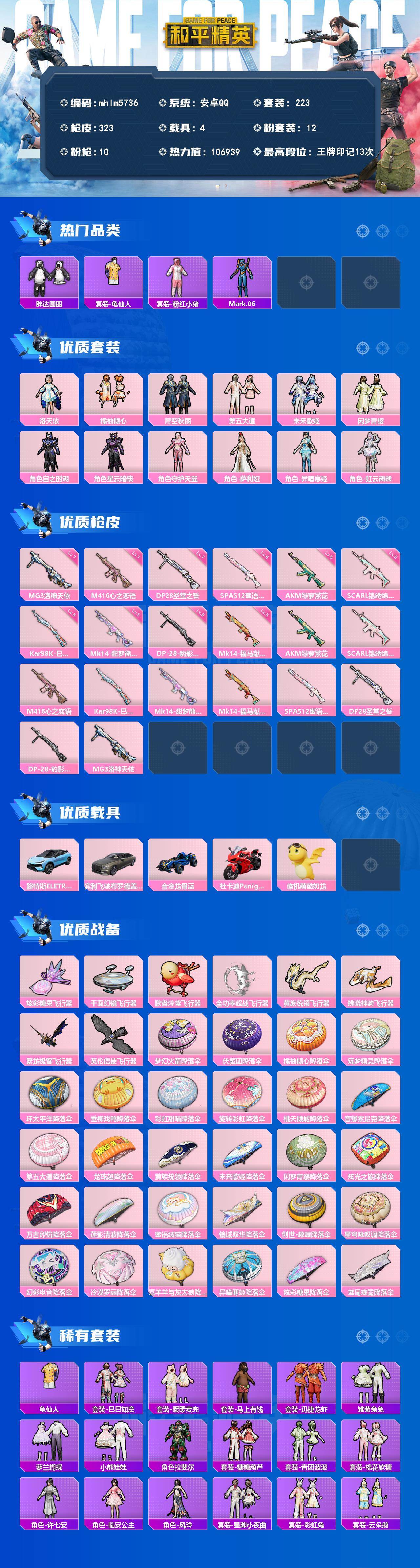 【mhlm5736】安卓 手Q-12粉装-10特效枪-4载具-8粉色飞行器-106939热力值-13王牌印记-223套装-323枪皮