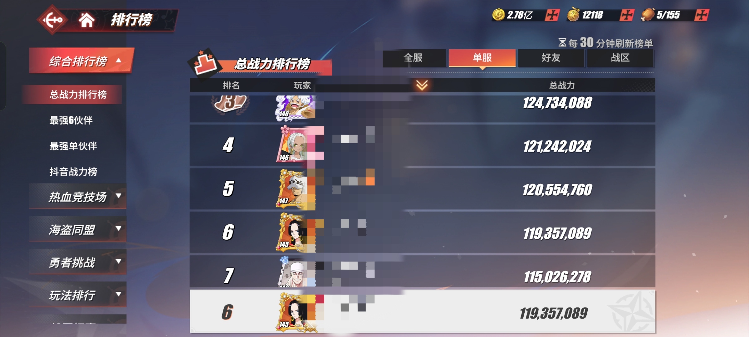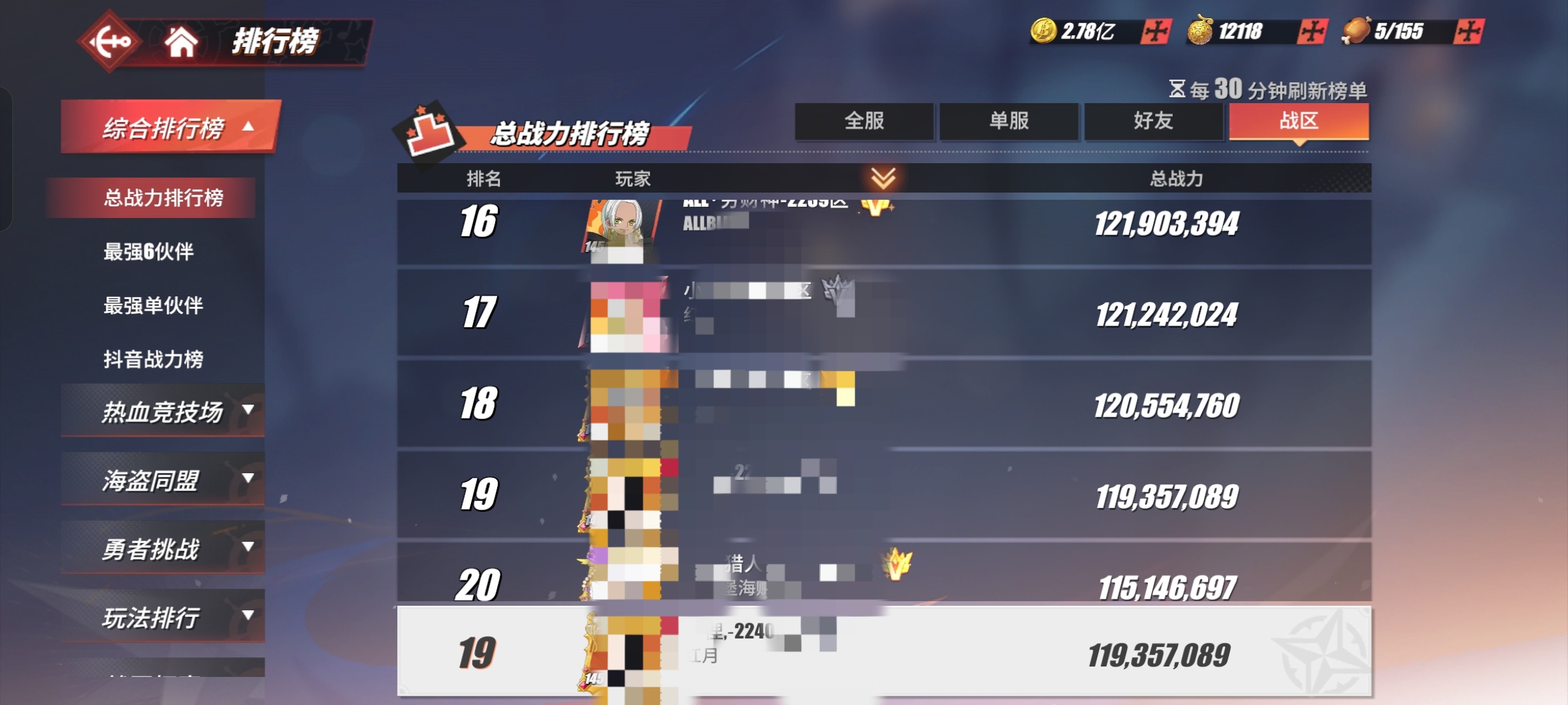 官服22xx区,1.2亿总站,单服第六,战区19,差距不大。满电话虫,变身器少一个,四神船,5个98