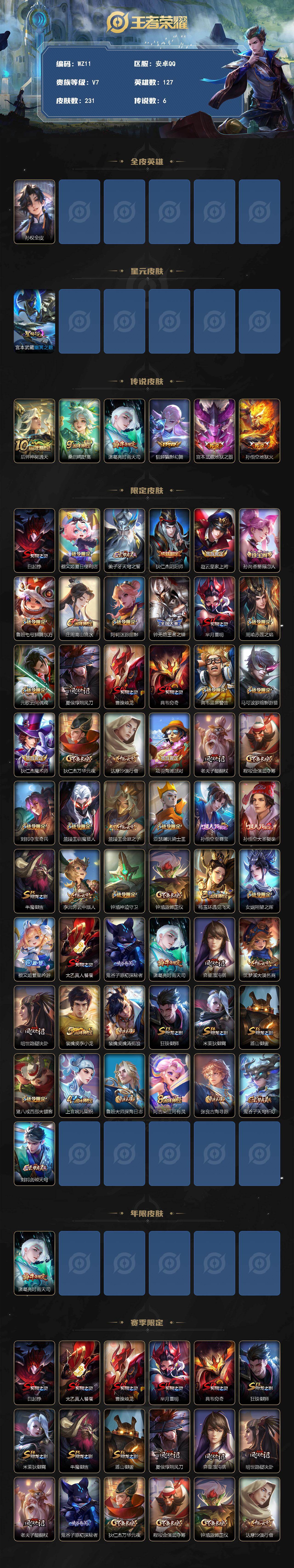 【WZ11】贵族7/皮肤231/传说6/史诗55/英雄127/孙权全皮/宫本武藏幽冥之眼/后羿神树通天/桑启鸣野蒿/诸葛亮时雨天司/貂蝉猫影幻舞/宫本武藏地狱之眼/孙悟空地狱火/白起狰/蔡文姬夏日便利店/姜子牙天穹之誓/狄仁杰阴阳师/赵云皇家上将/孙尚香蔷薇恋人/鲁班七号狮舞东方/庄周高山流水/阿轲迷踪丽影/钟无艳王者之锤/芈月重明/周瑜赤莲之焰/元歌云间偶戏/夏侯惇朔风刀/曹操烛龙/典韦穷奇/典韦蓝屏警告/马可波罗暗影游猎/狄仁杰魔术师/狄仁杰万华元夜/达摩沙漠行僧/项羽海滩派对/老夫子醍醐杖